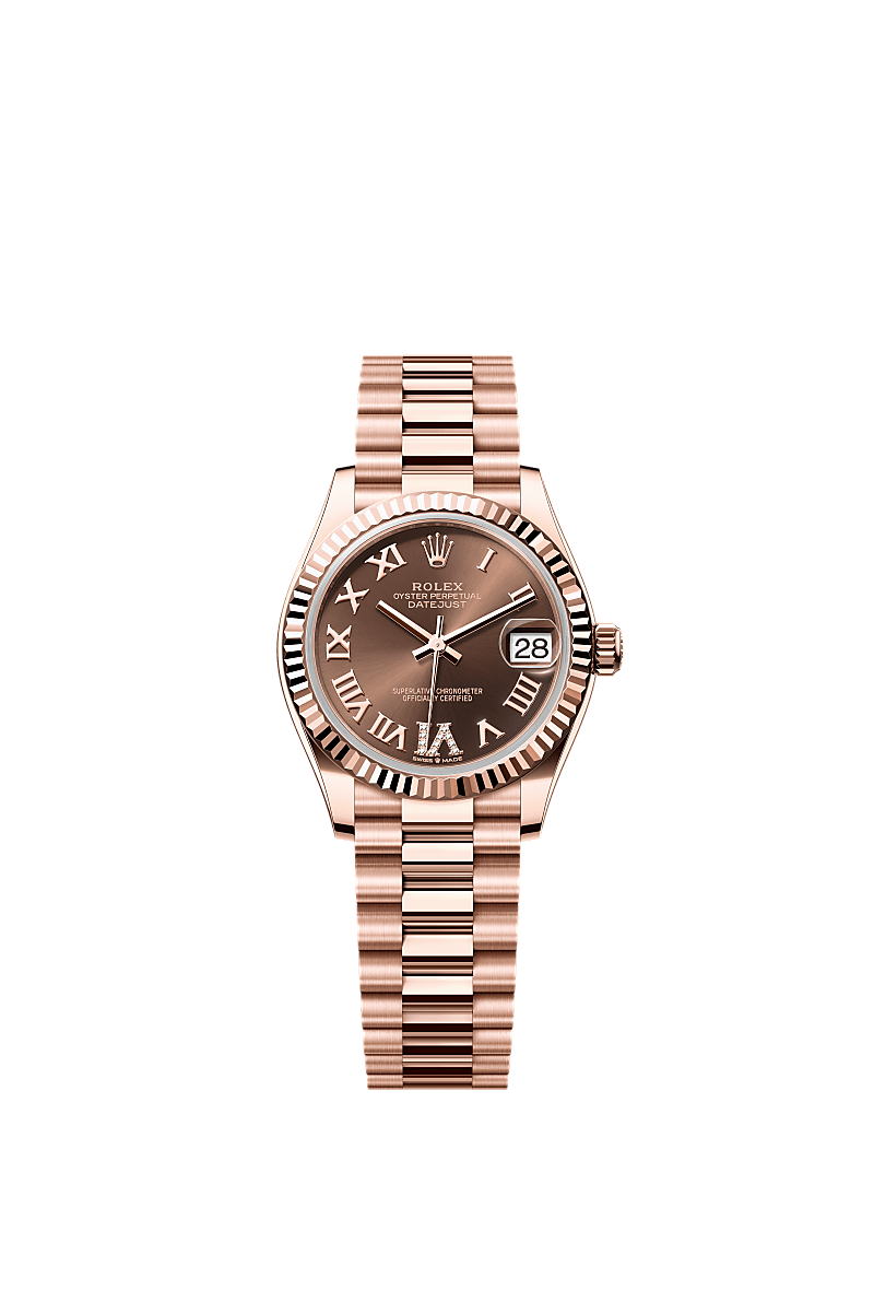This Oyster Perpetual Datejust 31 in 18 ct Everose gold features a chocolate, diamond-set dial and a President bracelet.