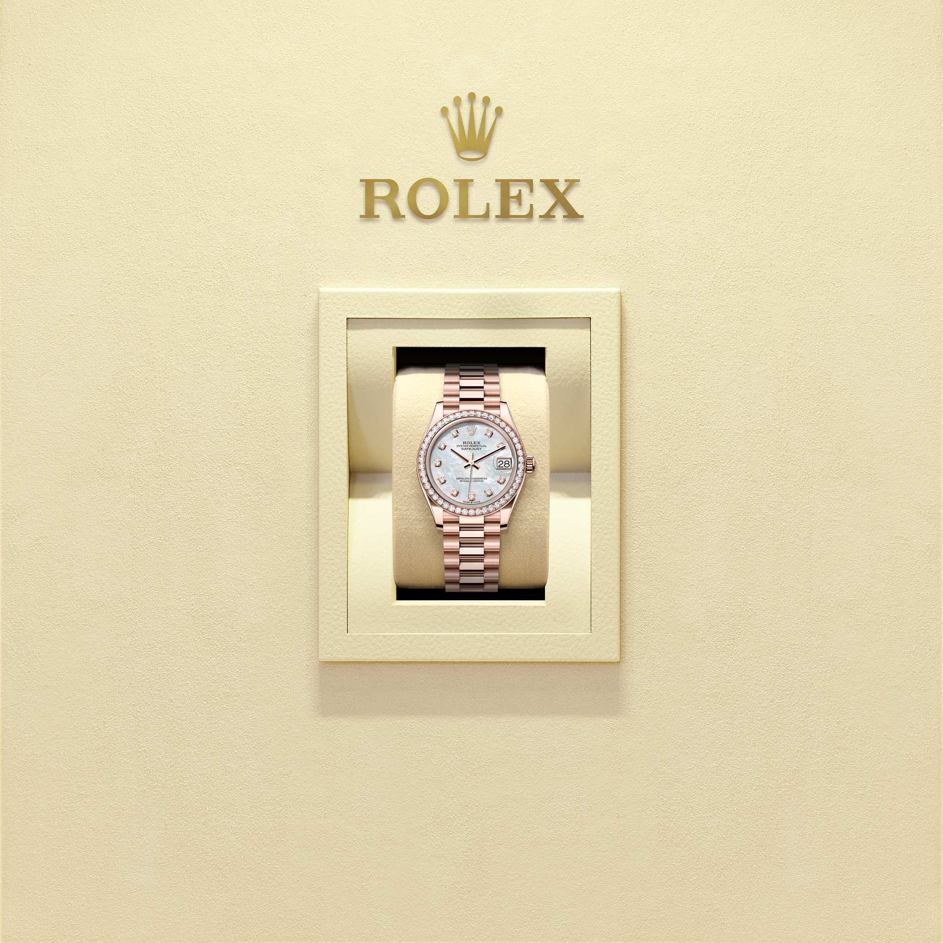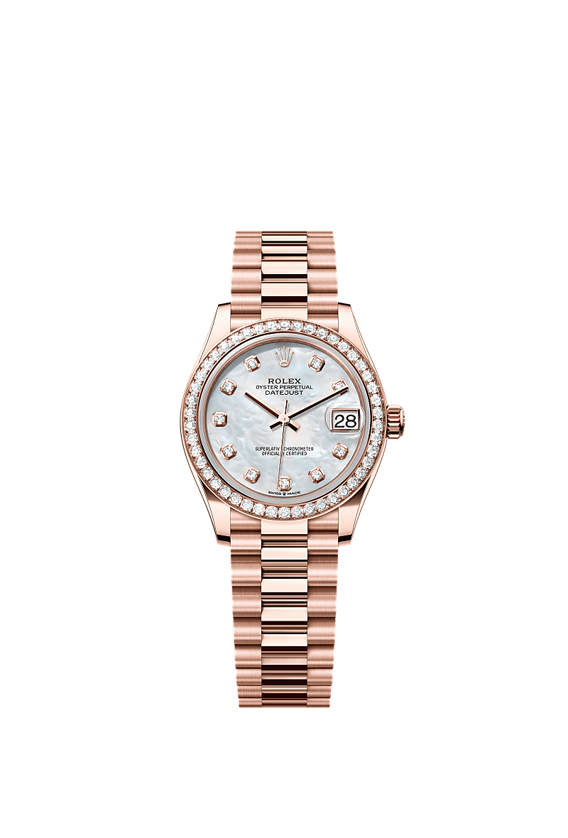 This Oyster Perpetual Datejust 31 in 18 ct Everose gold features a white mother-of-pearl, diamond-set dial and a President bracelet.