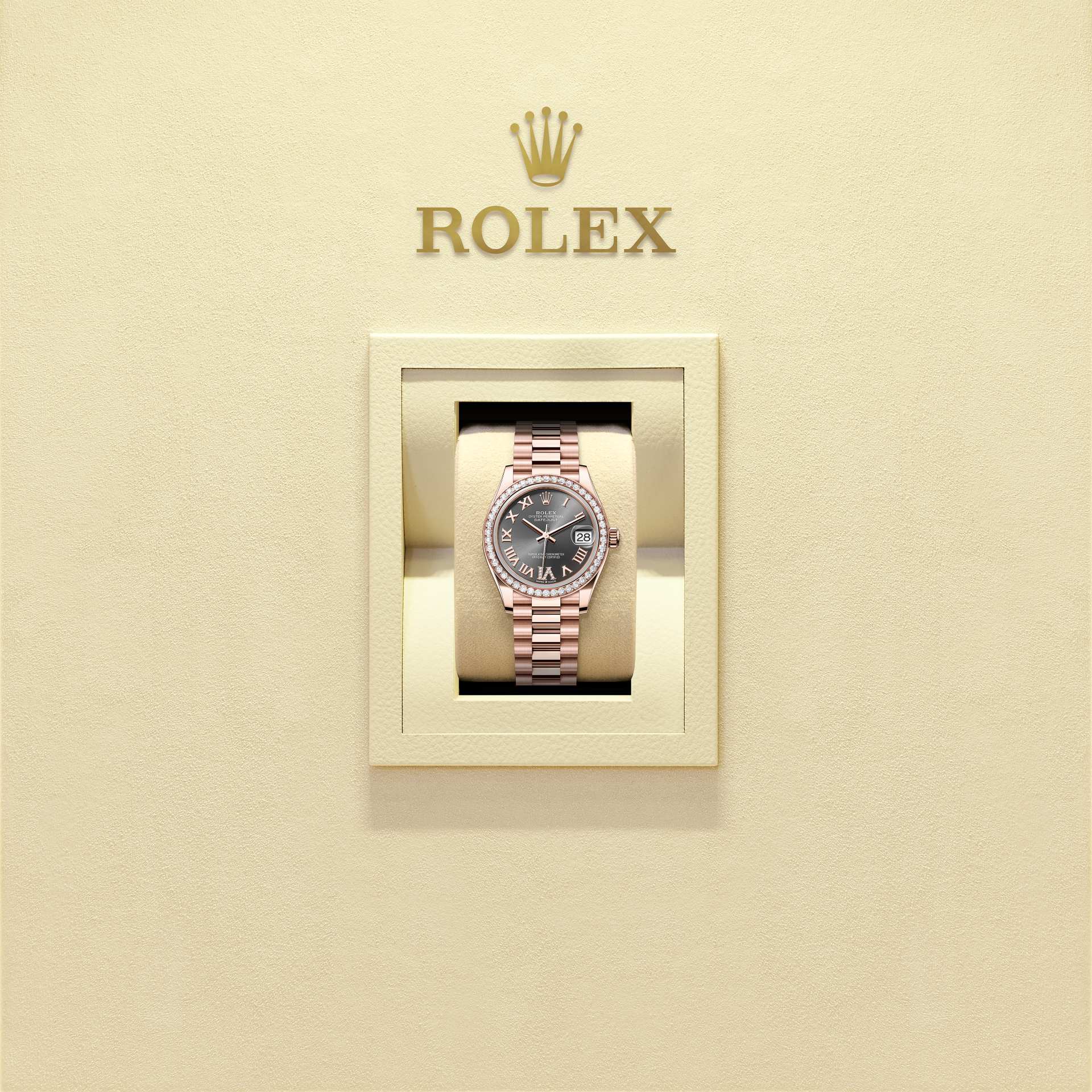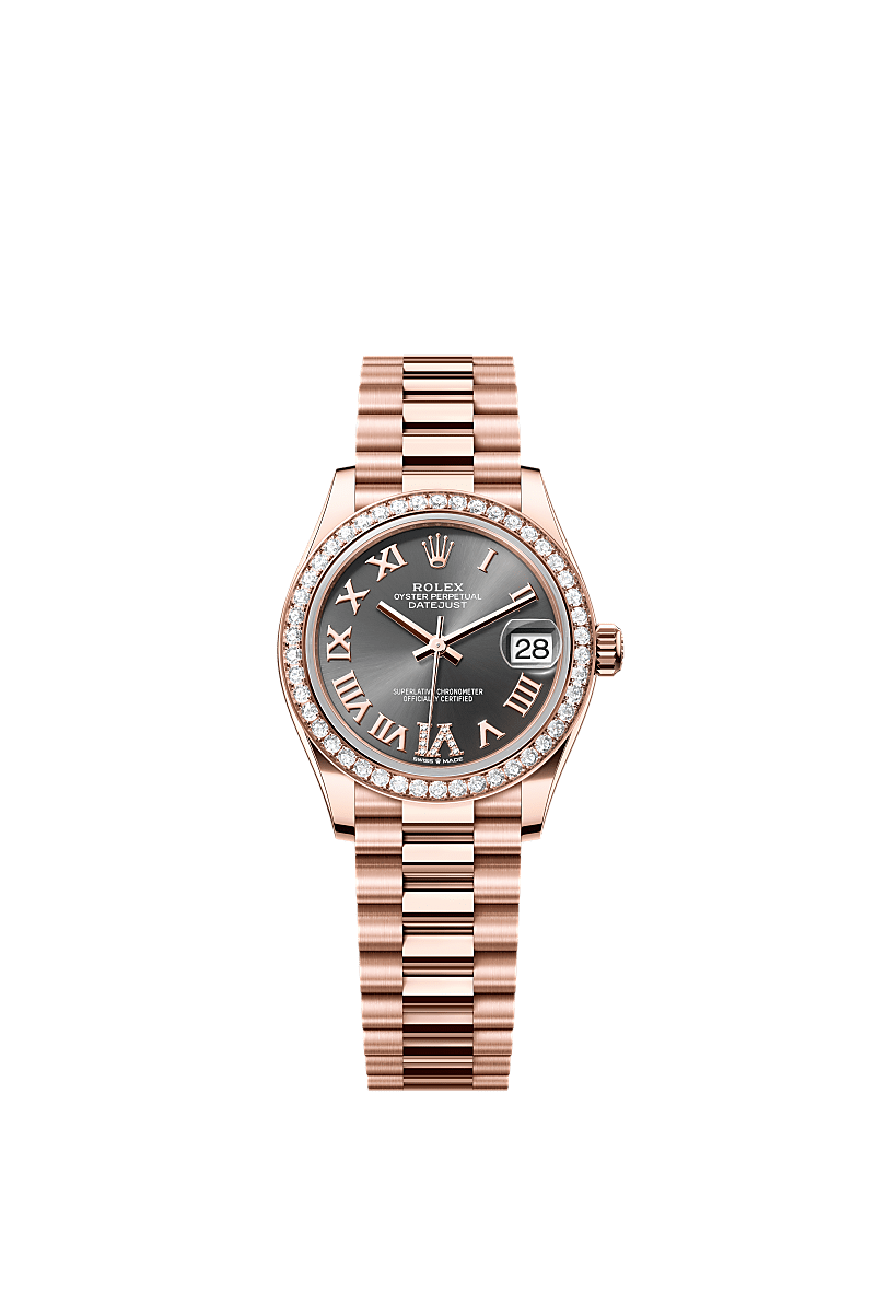 This Oyster Perpetual Datejust 31 in 18 ct Everose gold features a slate, diamond-set dial and a President bracelet.