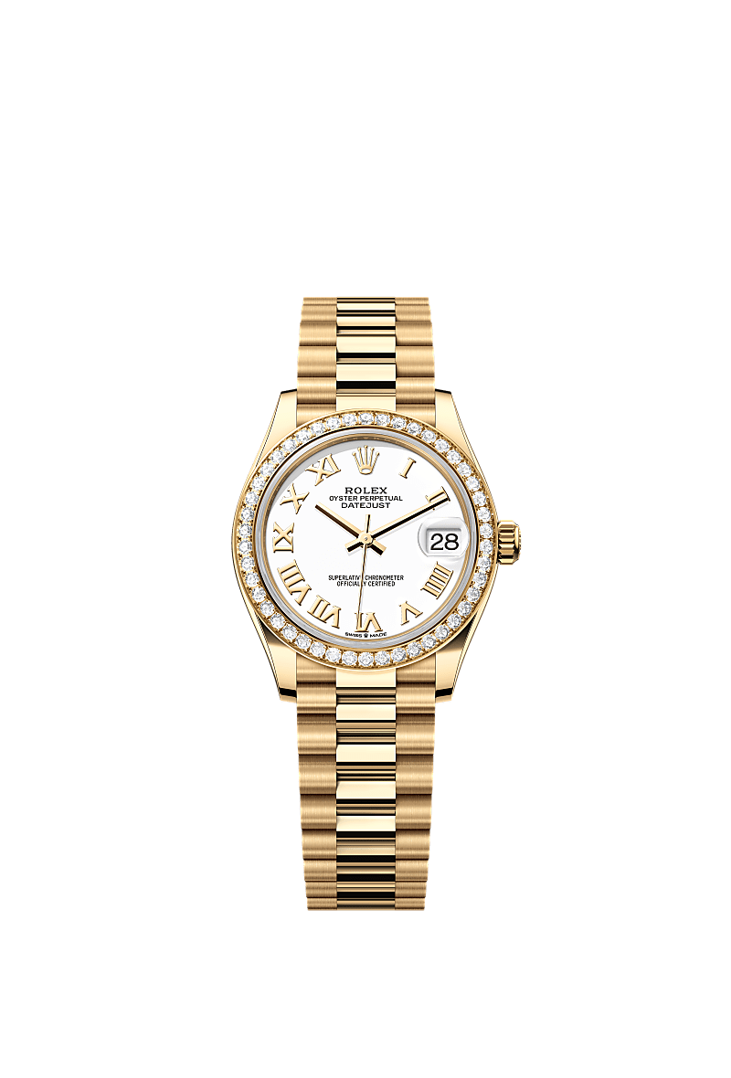 This Oyster Perpetual Datejust 31 in 18 ct yellow gold features a white dial and a President bracelet.