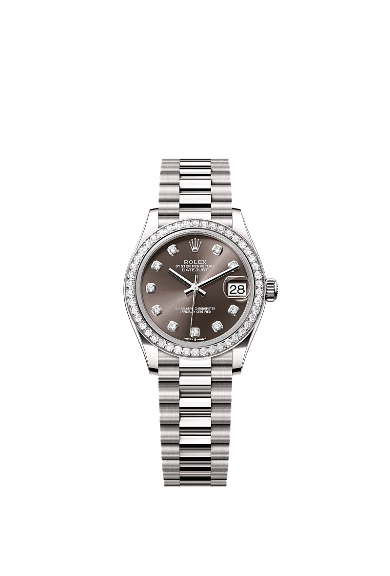 This Oyster Perpetual Datejust 31 in 18 ct white gold features a dark grey, diamond-set dial and a President bracelet.