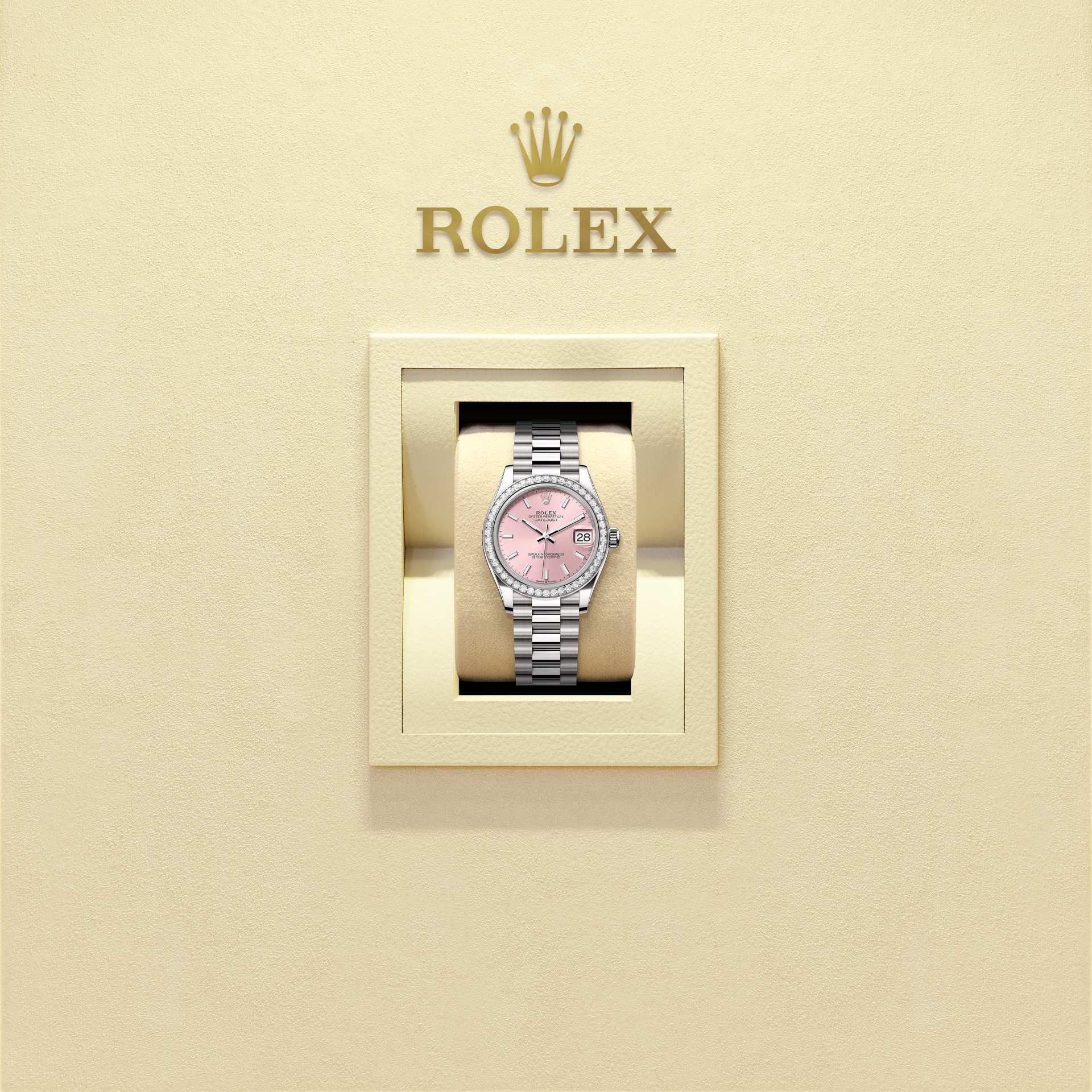 This Oyster Perpetual Datejust 31 in 18 ct white gold features a pink dial and a President bracelet.