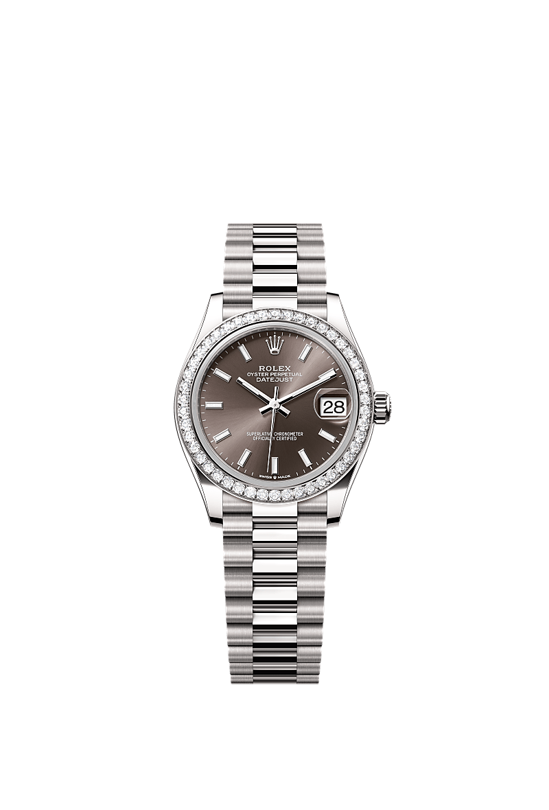 This Oyster Perpetual Datejust 31 in 18 ct white gold features a dark grey dial and a President bracelet.