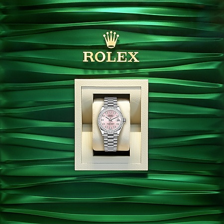 This Oyster Perpetual Datejust 31 in 18 ct white gold features a pink, diamond-set dial and a President bracelet.