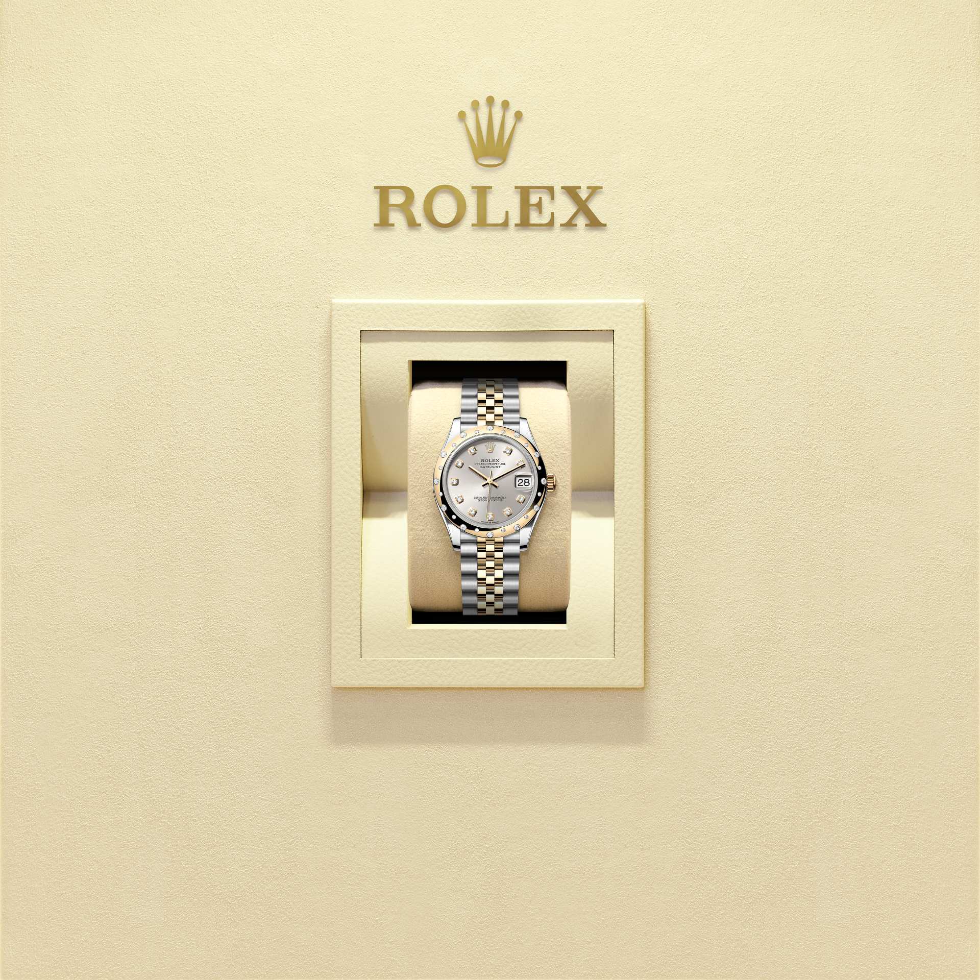 This Oyster Perpetual Datejust 31 in Oystersteel and yellow gold features a silver, diamond-set dial and a Jubilee bracelet.