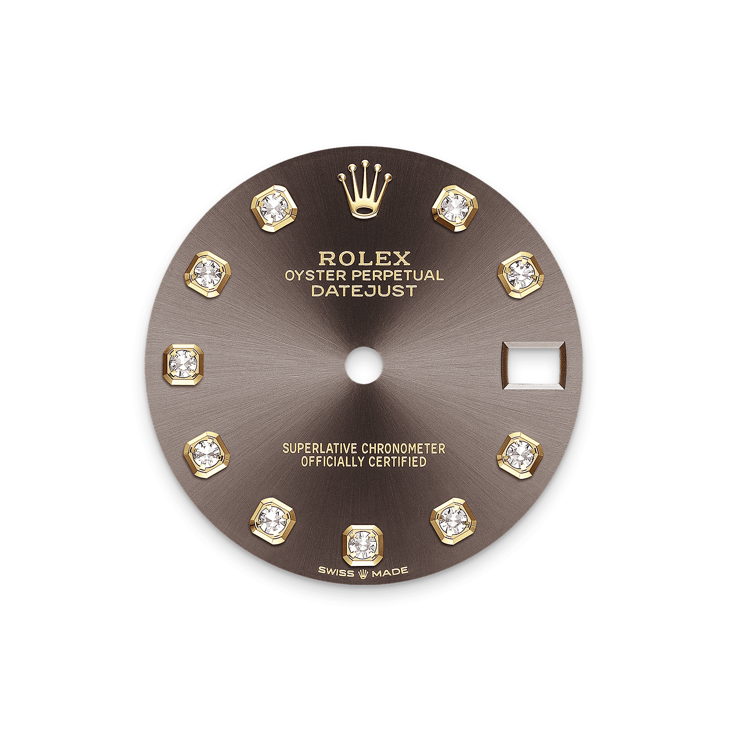 This dial features diamonds in 18 ct gold settings. The sunray finish creates delicate light reflections on many dials in the Oyster Perpetual collection. It is obtained using masterful brushing techniques that create grooves running outwards from the centre of the dial.
