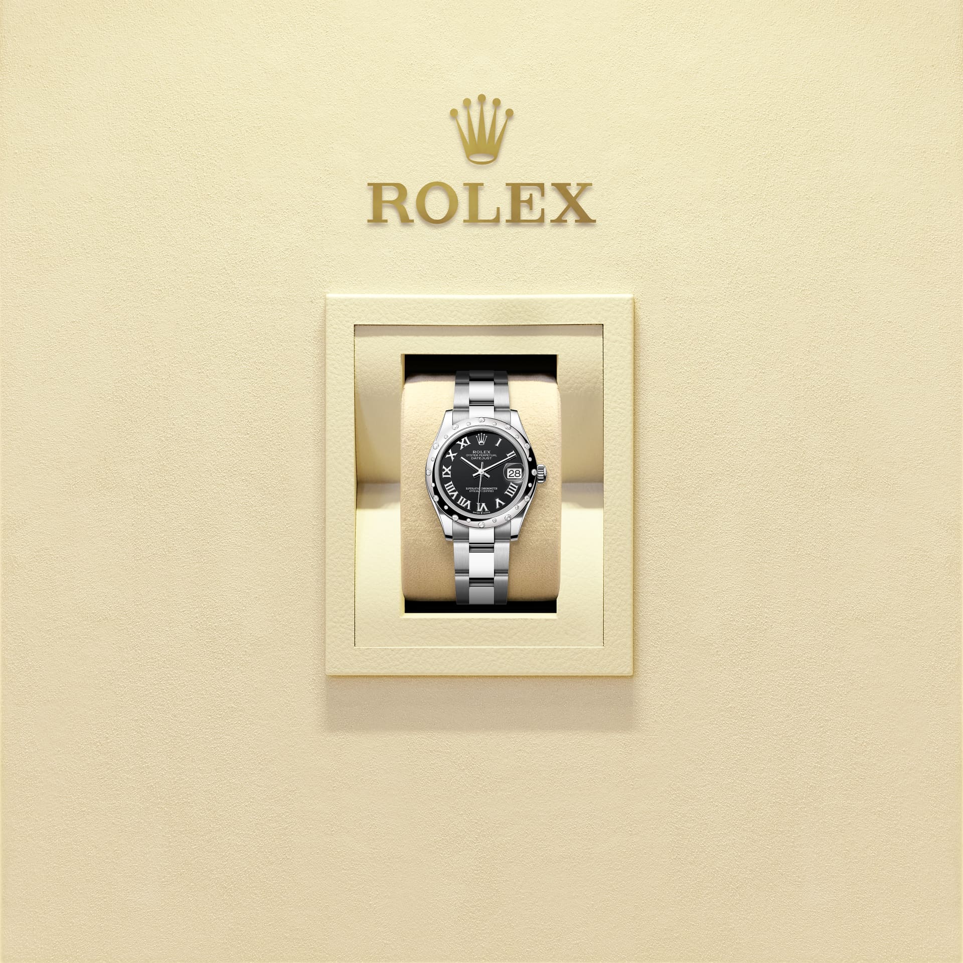 This Oyster Perpetual Datejust 31 in Oystersteel and white gold features a bright black dial and an Oyster bracelet.