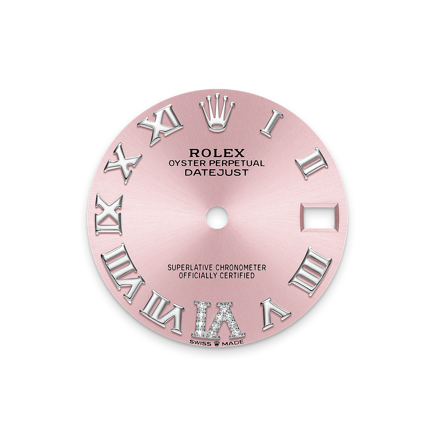 This dial features a large VI set with 11 diamonds. The sunray finish creates delicate light reflections on many dials in the Oyster Perpetual collection. It is obtained using masterful brushing techniques that create grooves running outwards from the centre of the dial.