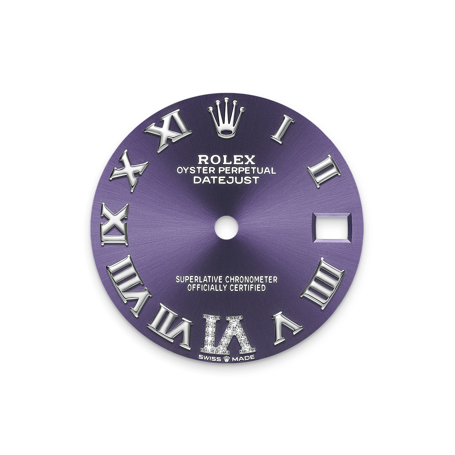 This dial features a large VI set with 11 diamonds. The sunray finish creates delicate light reflections on many dials in the Oyster Perpetual collection. It is obtained using masterful brushing techniques that create grooves running outwards from the centre of the dial.