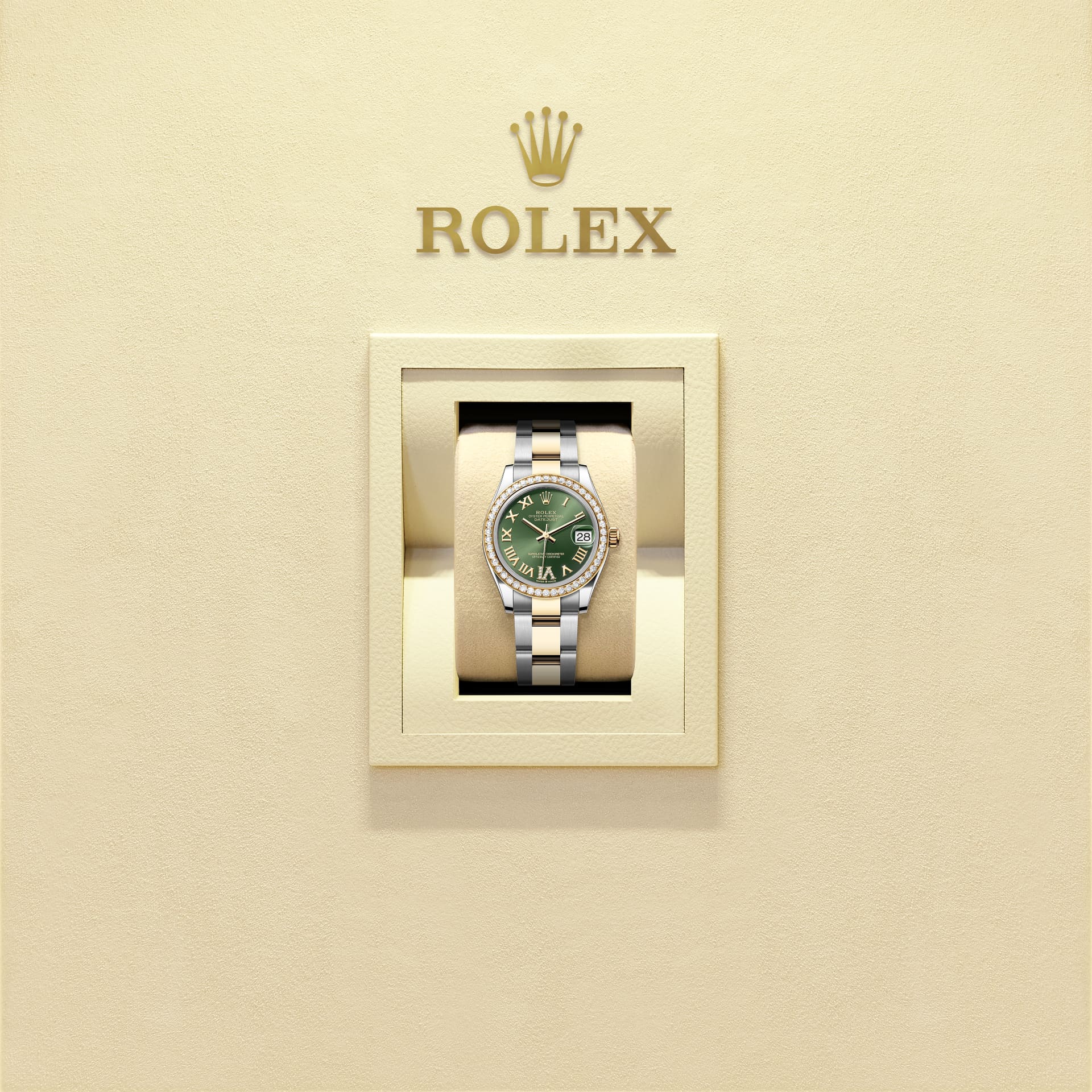 This Oyster Perpetual Datejust 31 in Oystersteel and yellow gold features an olive-green, diamond-set dial and an Oyster bracelet.