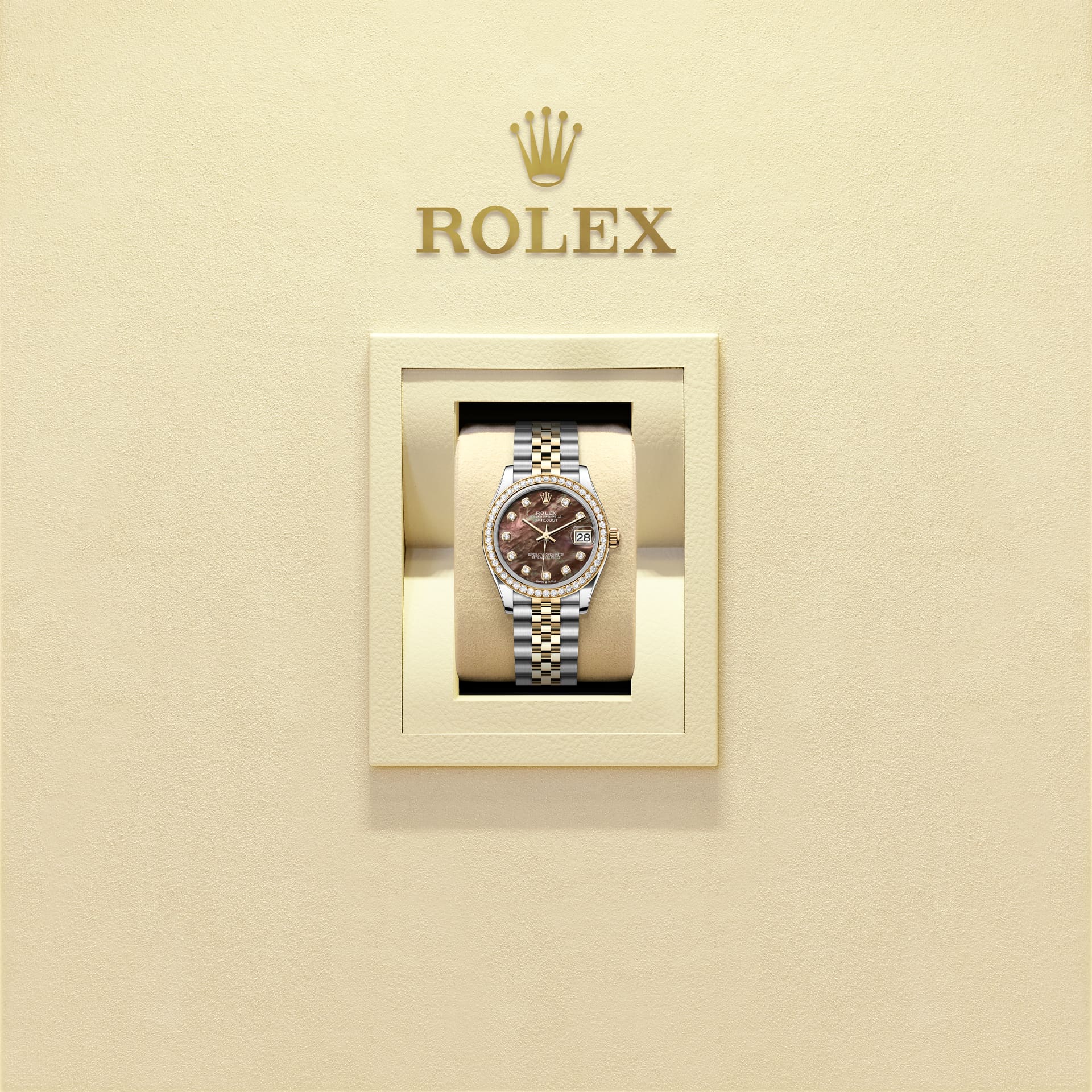 This Oyster Perpetual Datejust 31 in Oystersteel and yellow gold features a black mother-of-pearl, diamond-set dial and a Jubilee bracelet.