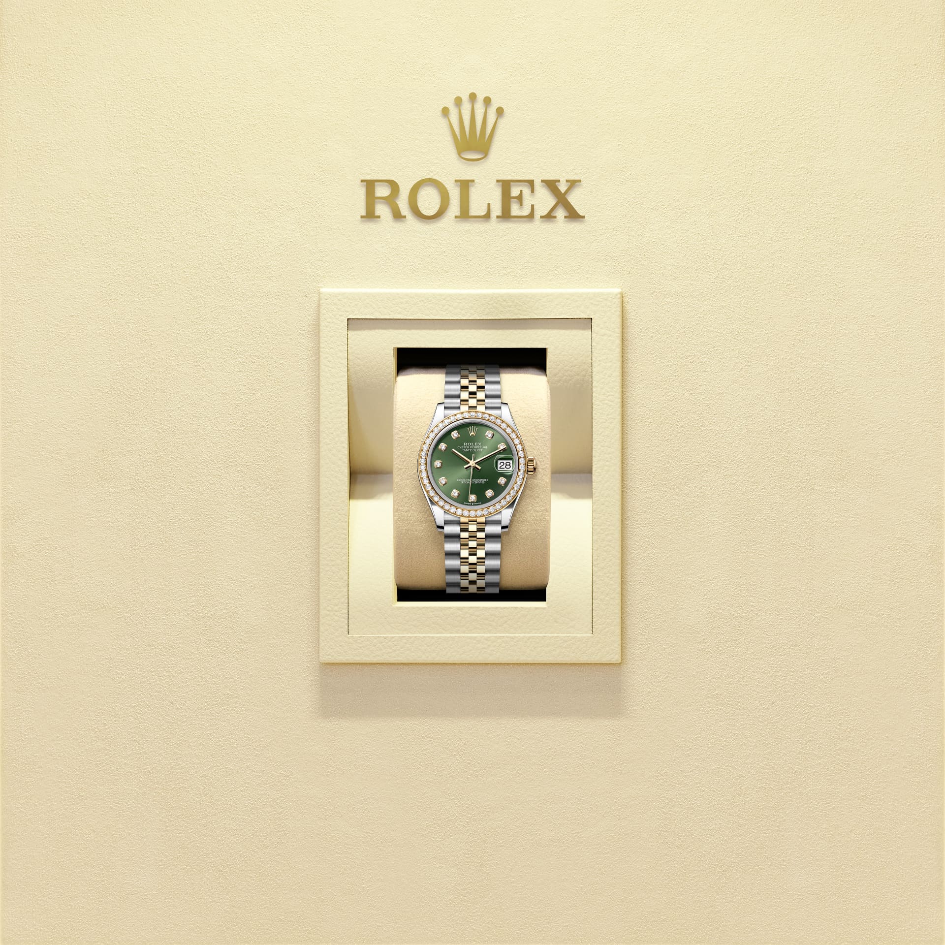 This Oyster Perpetual Datejust 31 in Oystersteel and yellow gold features an olive-green, diamond-set dial and a Jubilee bracelet.