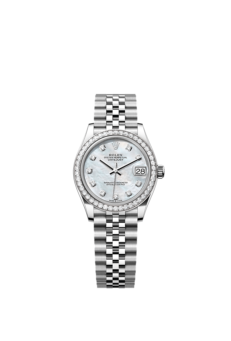 This Oyster Perpetual Datejust 31 in Oystersteel and white gold features a white mother-of-pearl, diamond-set dial and a Jubilee bracelet.