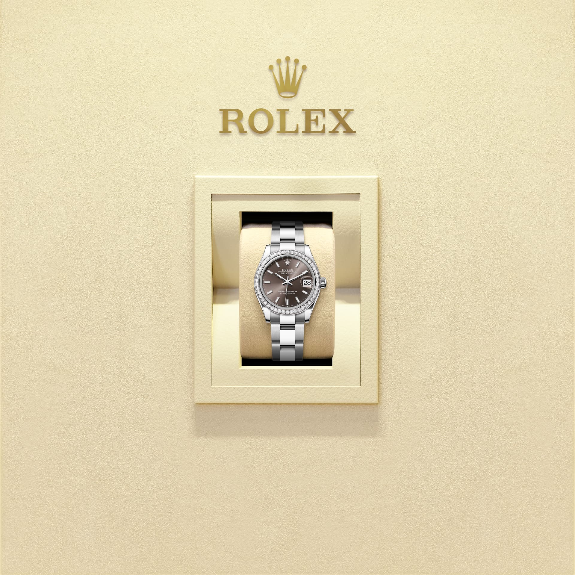 This Oyster Perpetual Datejust 31 in Oystersteel and white gold features a dark grey dial and an Oyster bracelet.