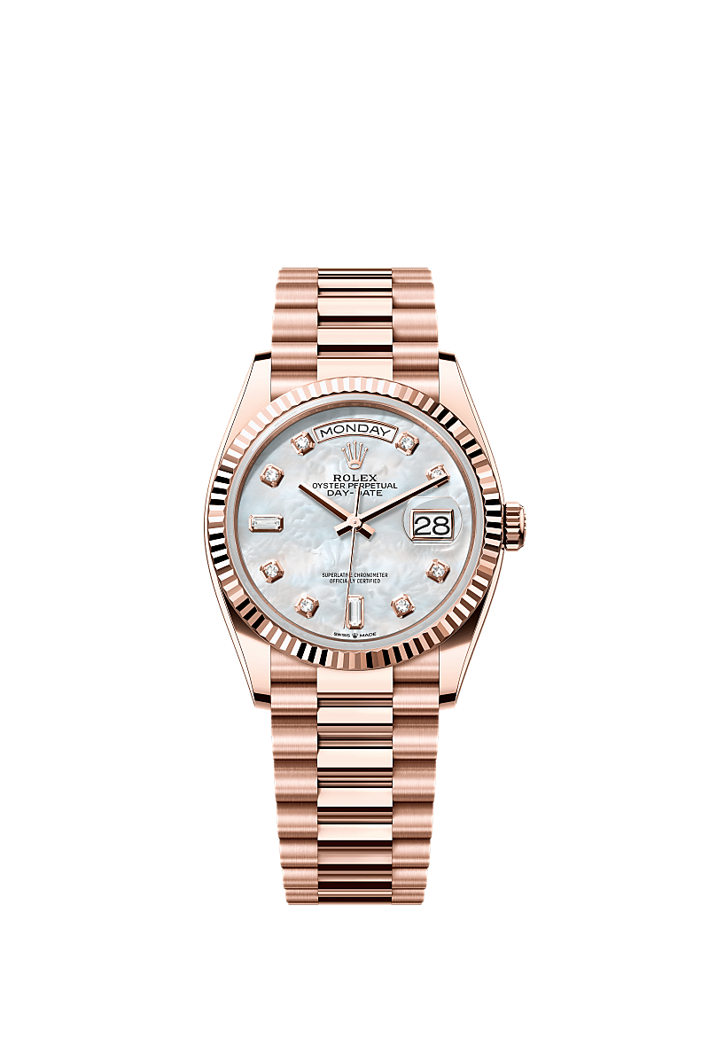 The Oyster Perpetual Day-Date 36 in 18 ct Everose gold with a white mother-of-pearl, diamond-set dial, fluted bezel and a President bracelet.