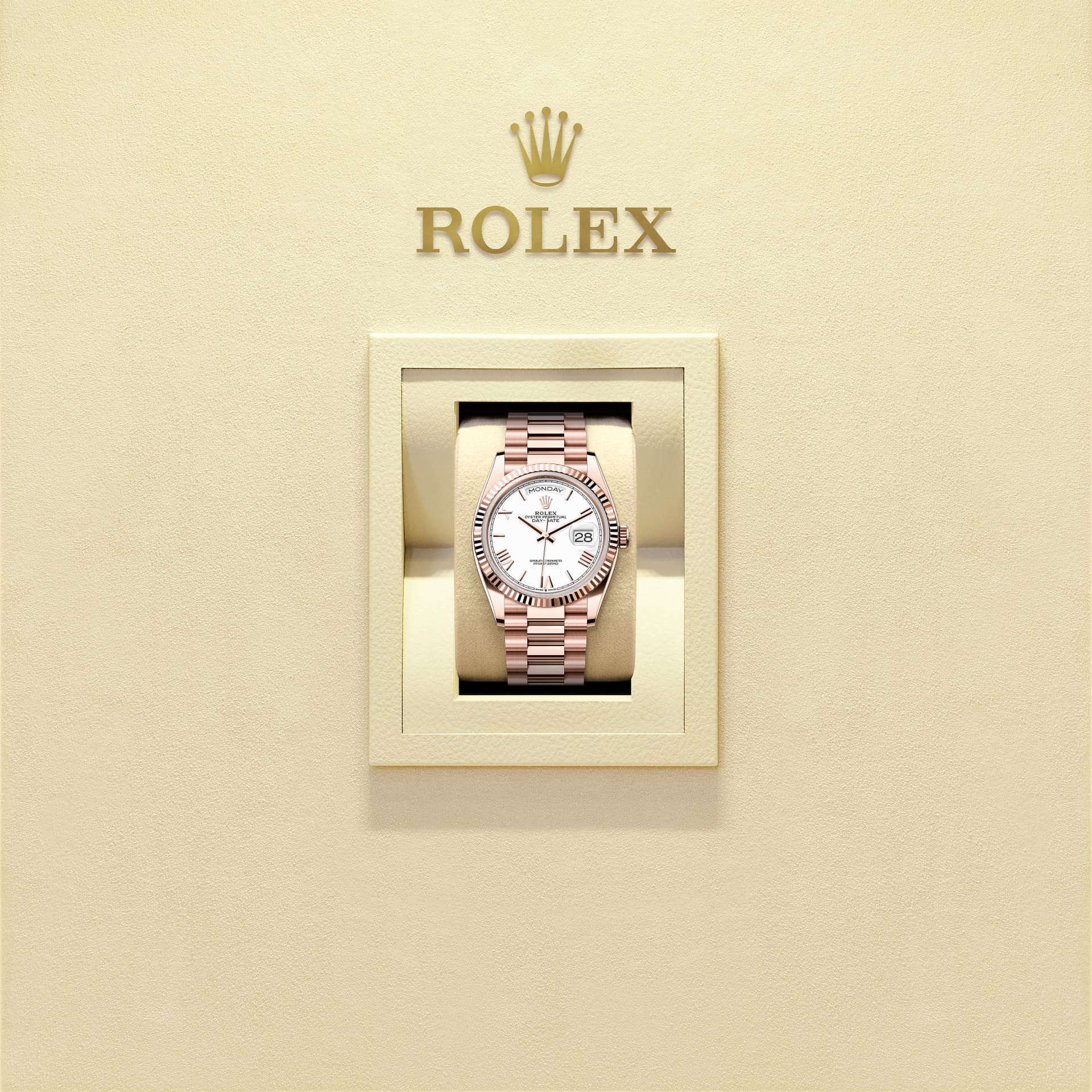 The Oyster Perpetual Day-Date 36 in 18 ct Everose gold with a white dial, fluted bezel and a President bracelet.