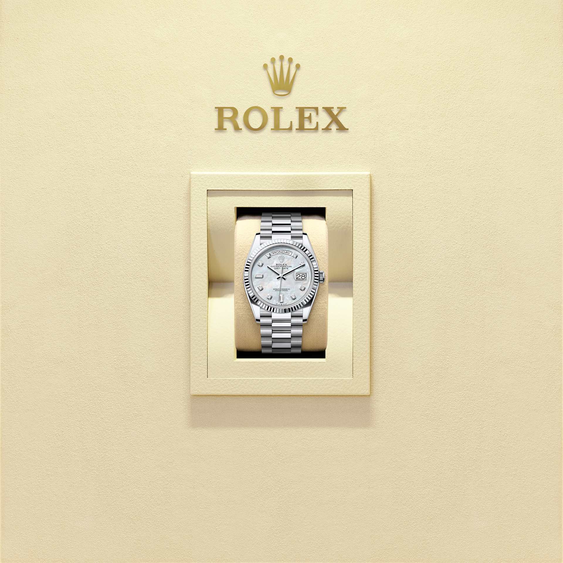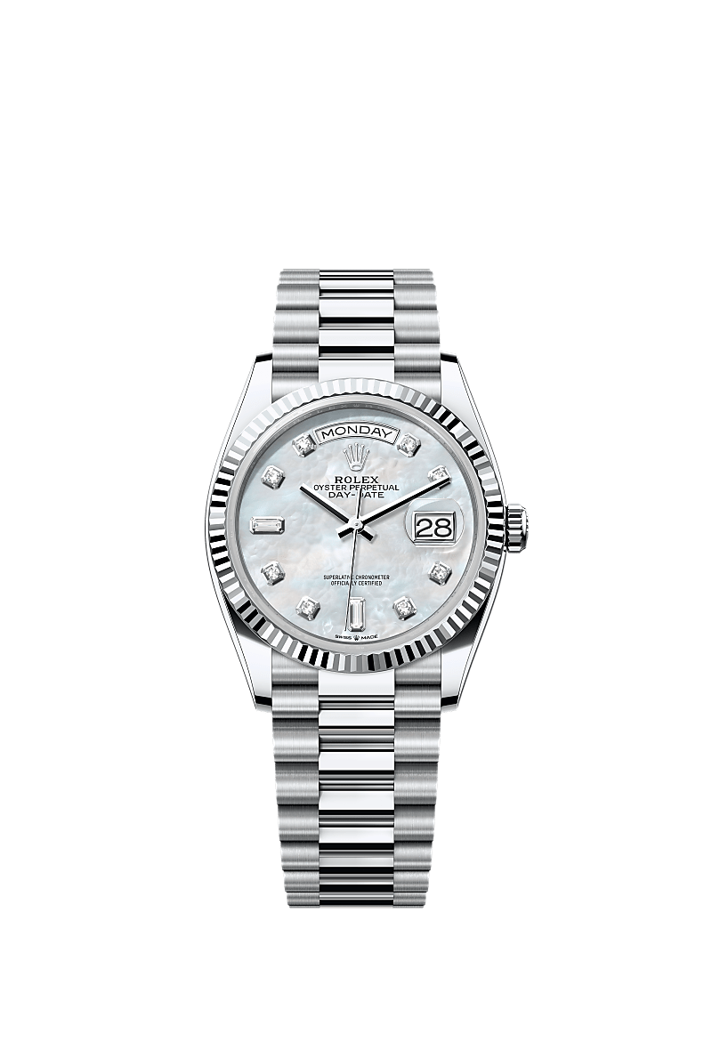 The Oyster Perpetual Day-Date 36 in platinum with a white mother-of-pearl, diamond-set dial, fluted bezel and a President bracelet.