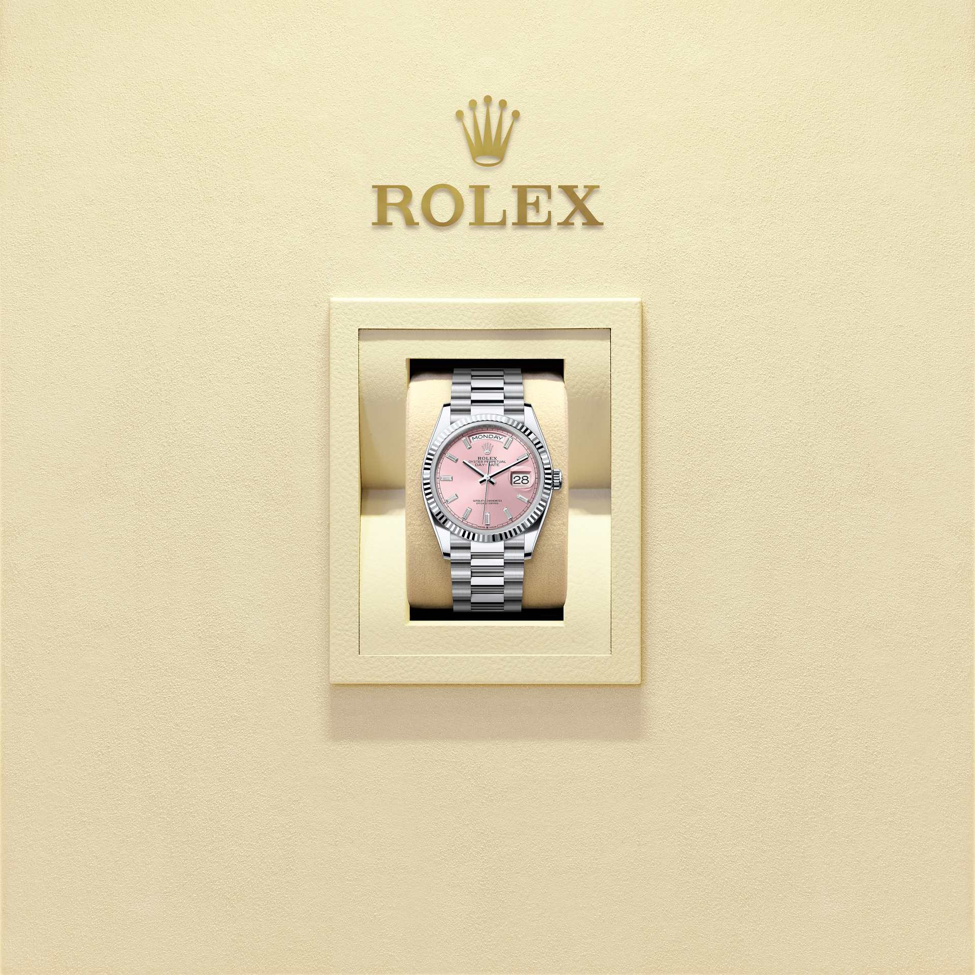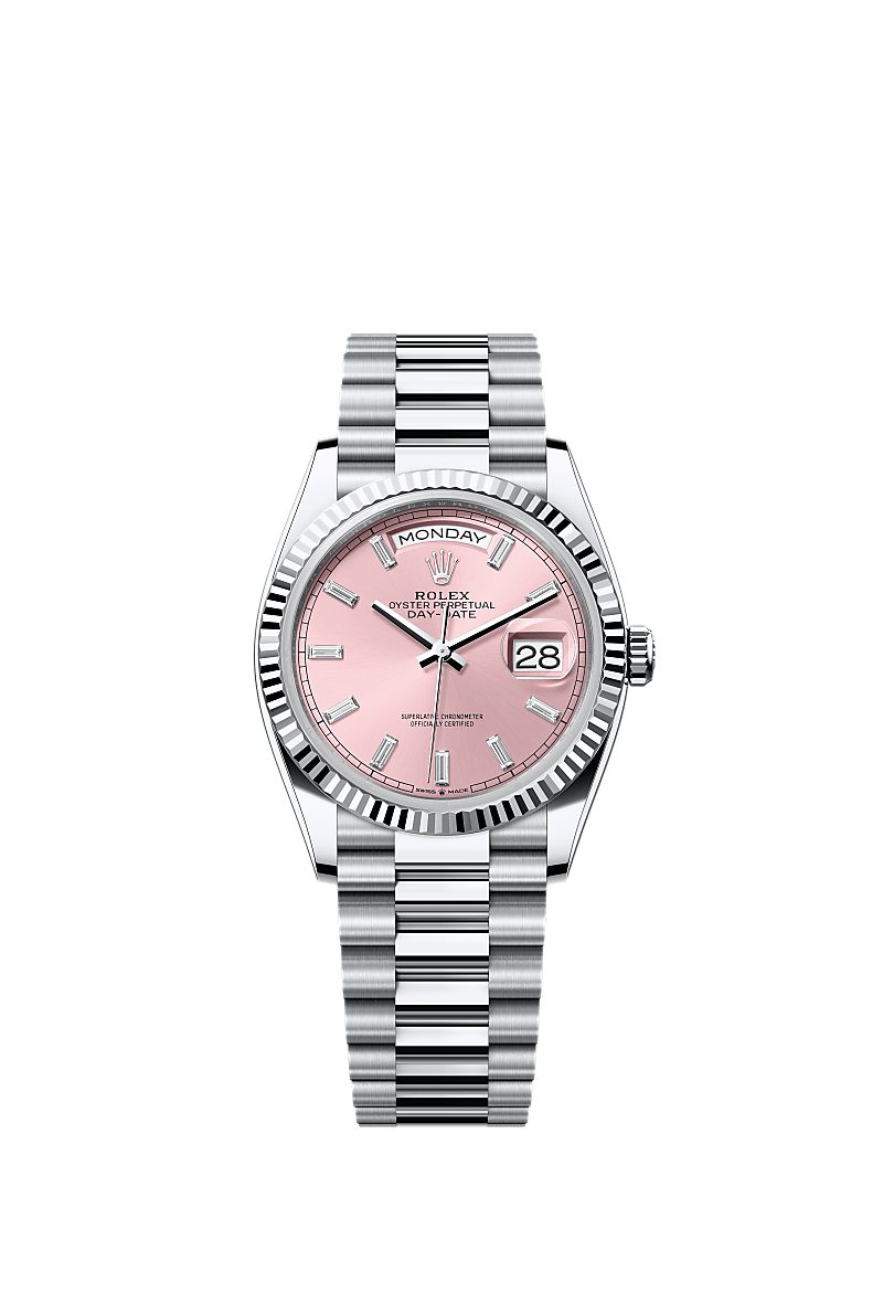 The Oyster Perpetual Day-Date 36 in platinum with a pink, diamond-set dial, fluted bezel and a President bracelet.