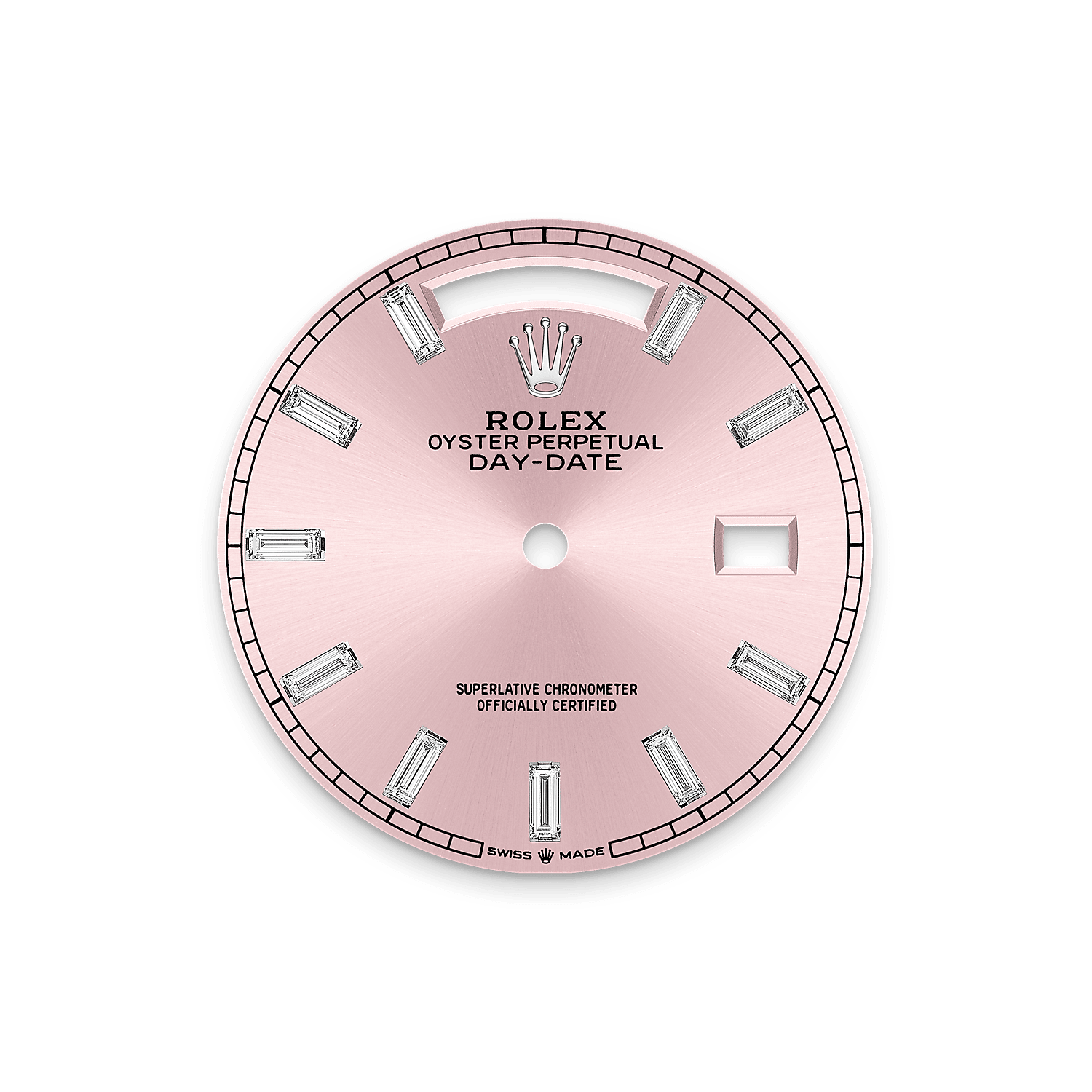 This dial features 10 baguette-cut diamonds. The sunray finish creates delicate light reflections on many dials in the Oyster Perpetual collection. It is obtained using masterful brushing techniques that create grooves running outwards from the centre of the dial.