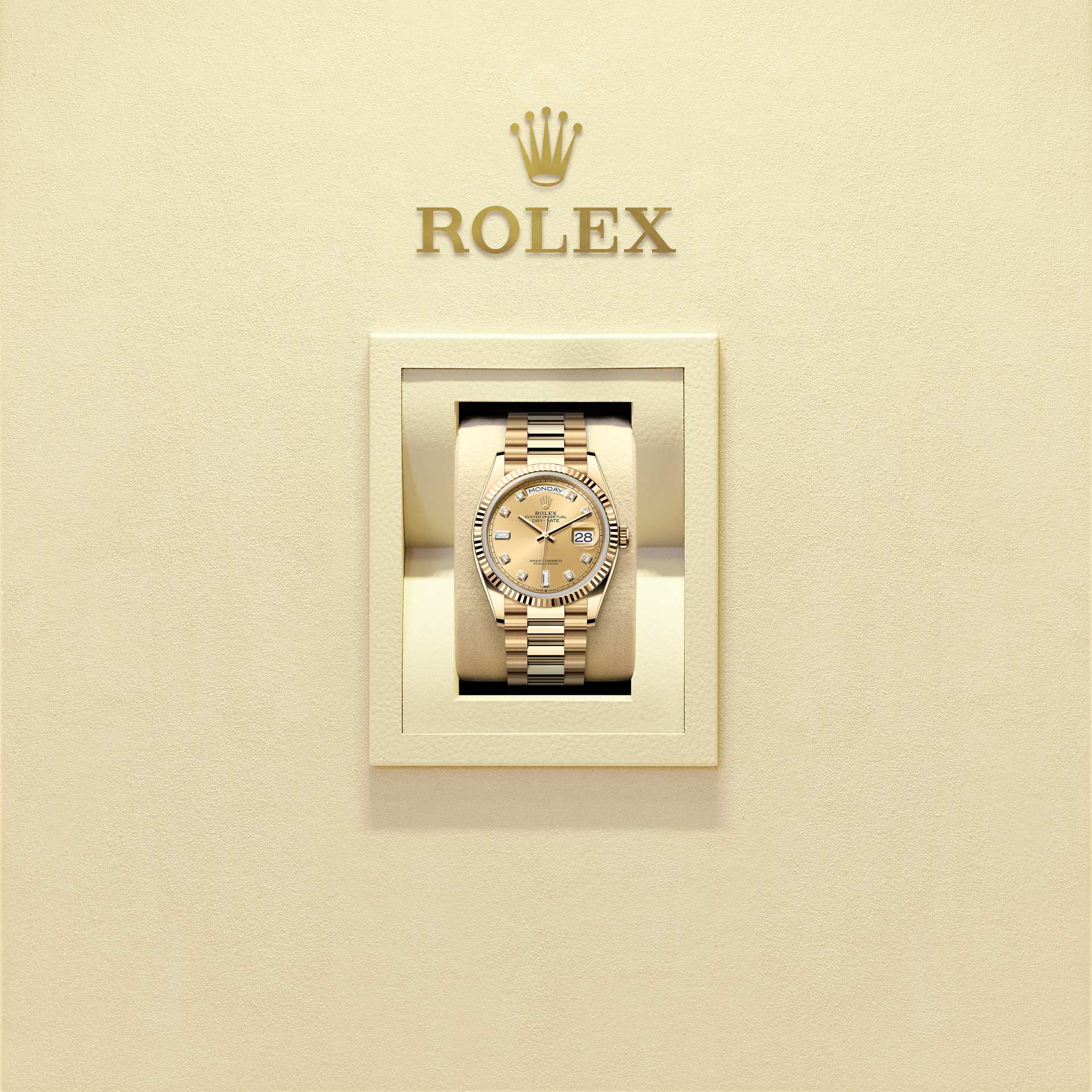 The Oyster Perpetual Day-Date 36 in 18 ct yellow gold with a champagne-colour, diamond-set dial, fluted bezel and a President bracelet.