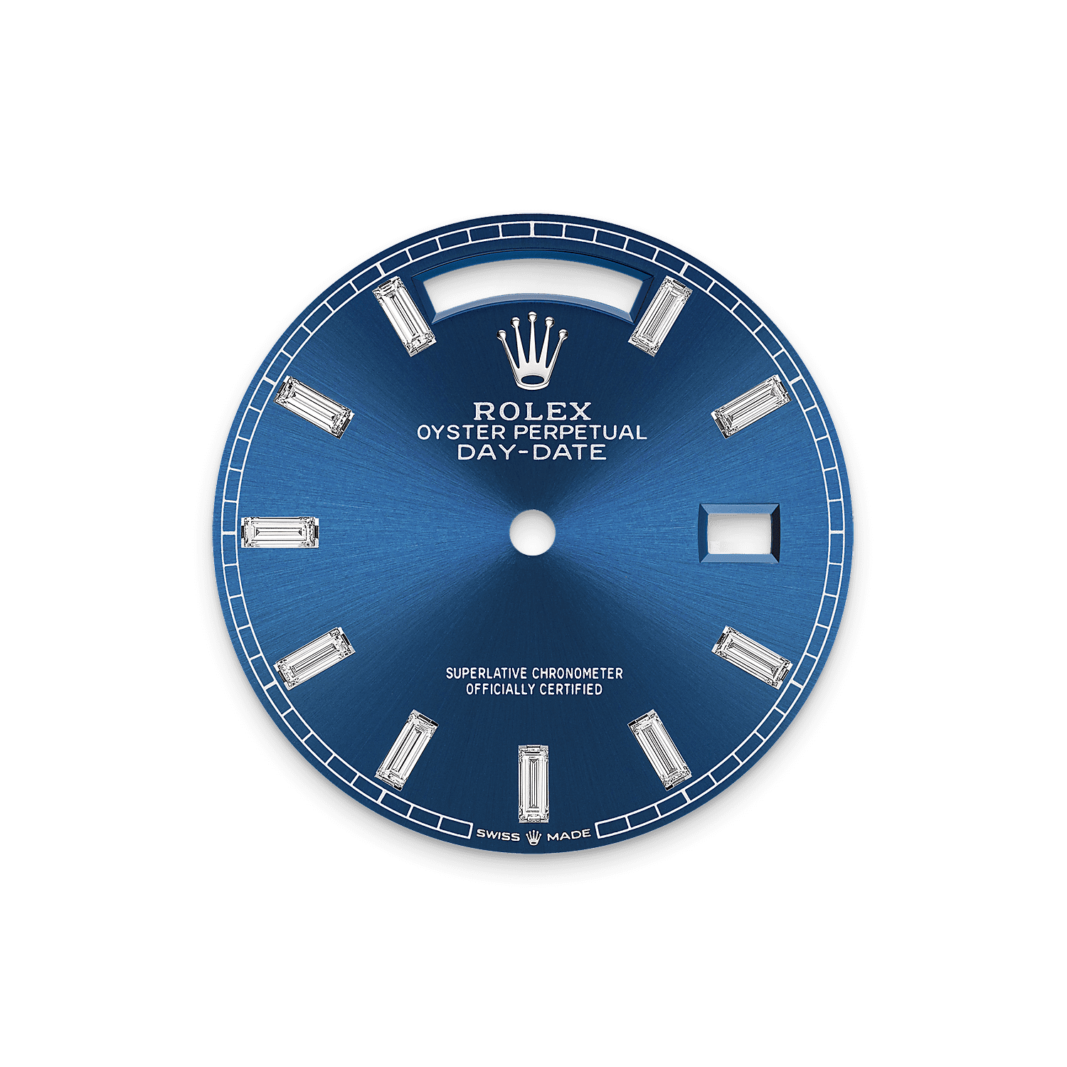 This dial features 10 baguette-cut diamonds. The sunray finish creates delicate light reflections on many dials in the Oyster Perpetual collection. It is obtained using masterful brushing techniques that create grooves running outwards from the centre of the dial.