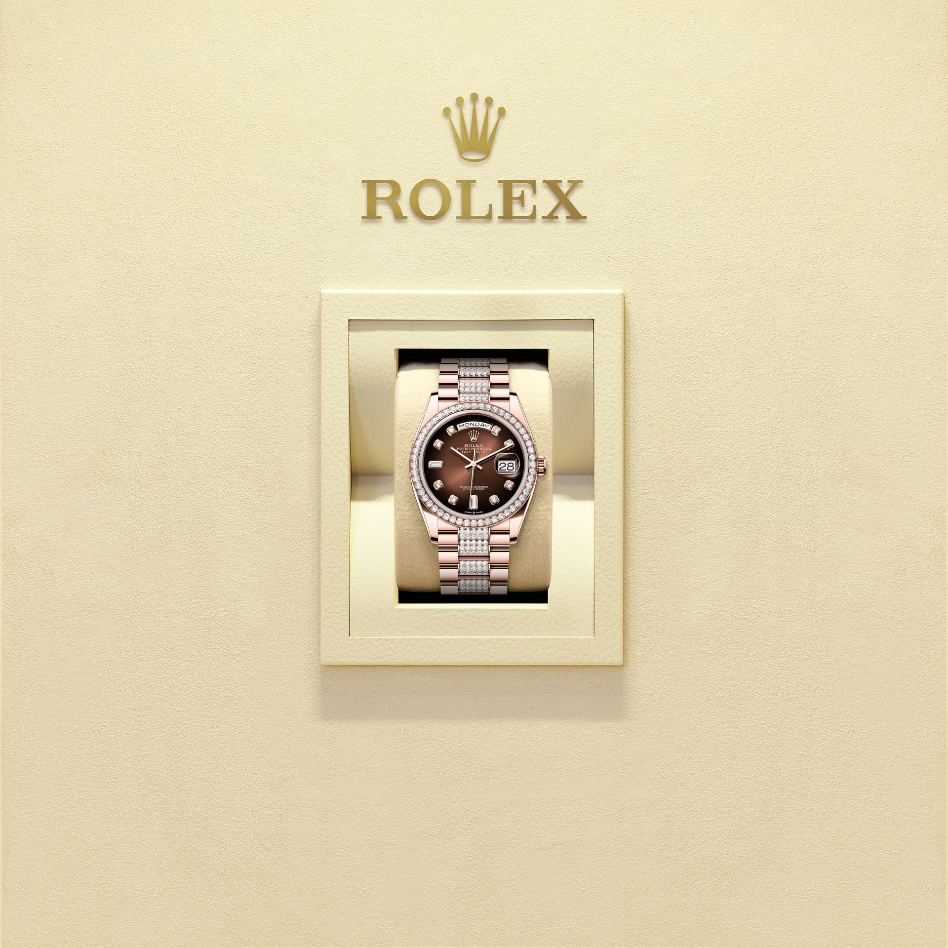 The Oyster Perpetual Day-Date 36 in 18 ct Everose gold, with a brown ombré, diamond-set dial, diamond-set bezel and a diamond-set President bracelet.