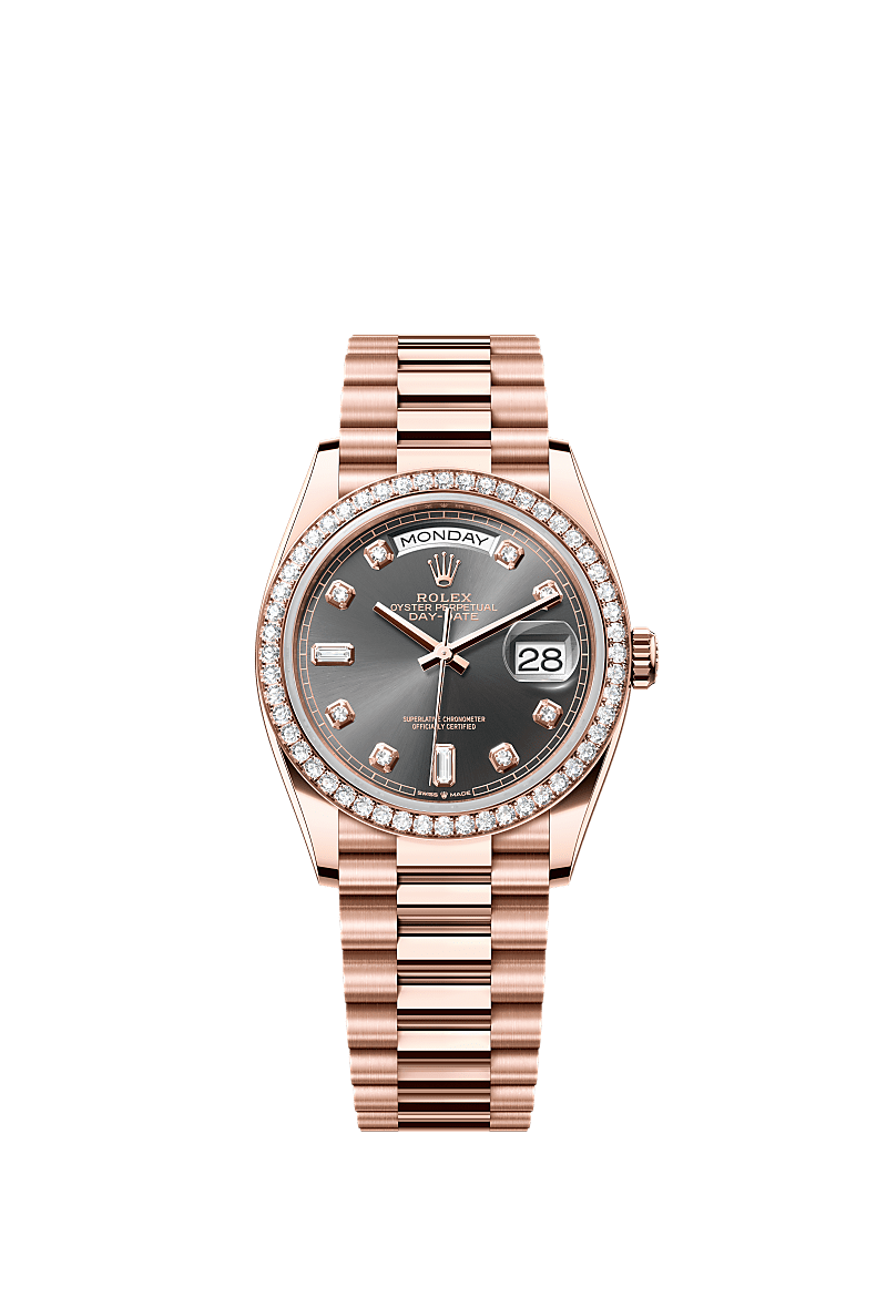 The Oyster Perpetual Day-Date 36 in 18 ct Everose gold, with a slate, diamond-set dial, diamond-set bezel and a President bracelet.