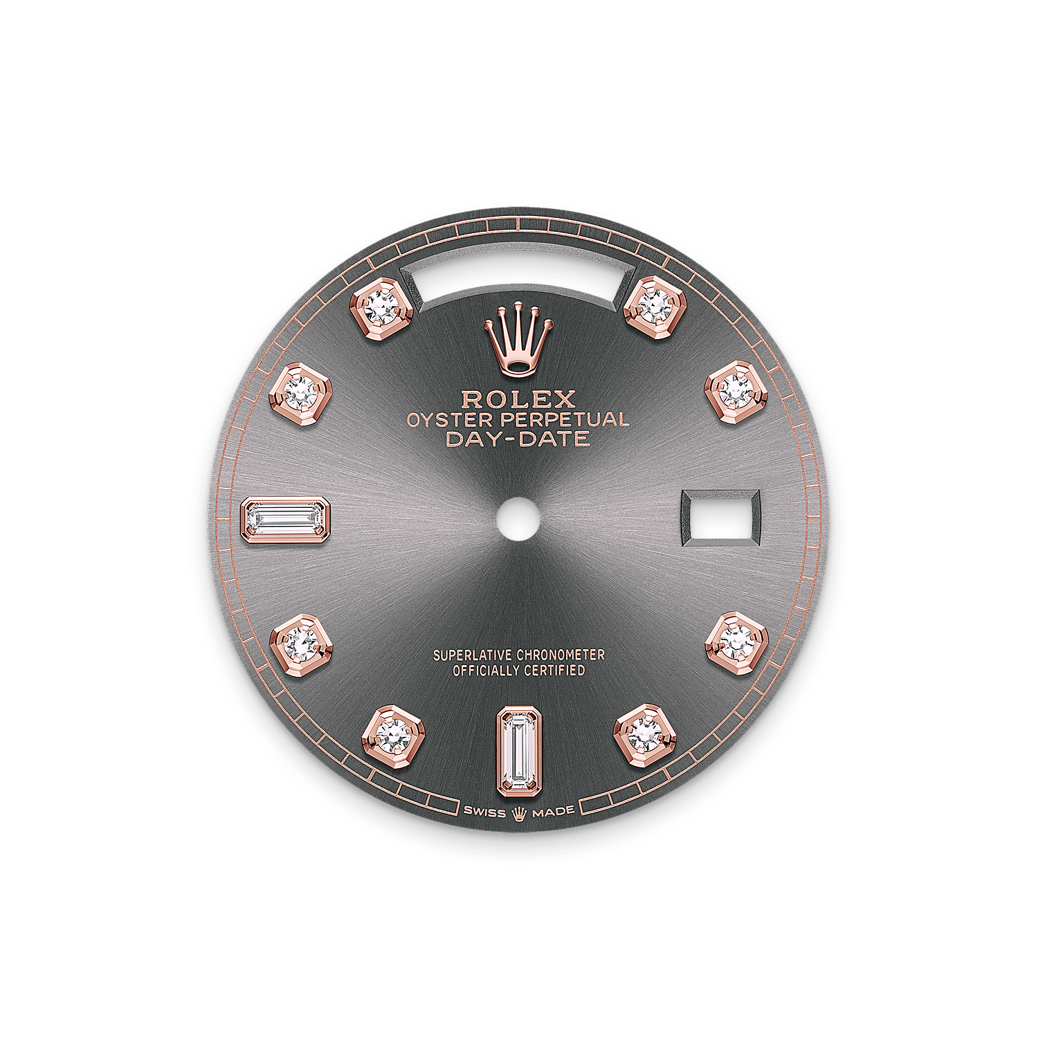 This dial features diamonds in 18 ct gold settings and baguette-cut diamonds at 6 and 9 o'clock. The sunray finish creates delicate light reflections on many dials in the Oyster Perpetual collection. It is obtained using masterful brushing techniques that create grooves running outwards from the centre of the dial.