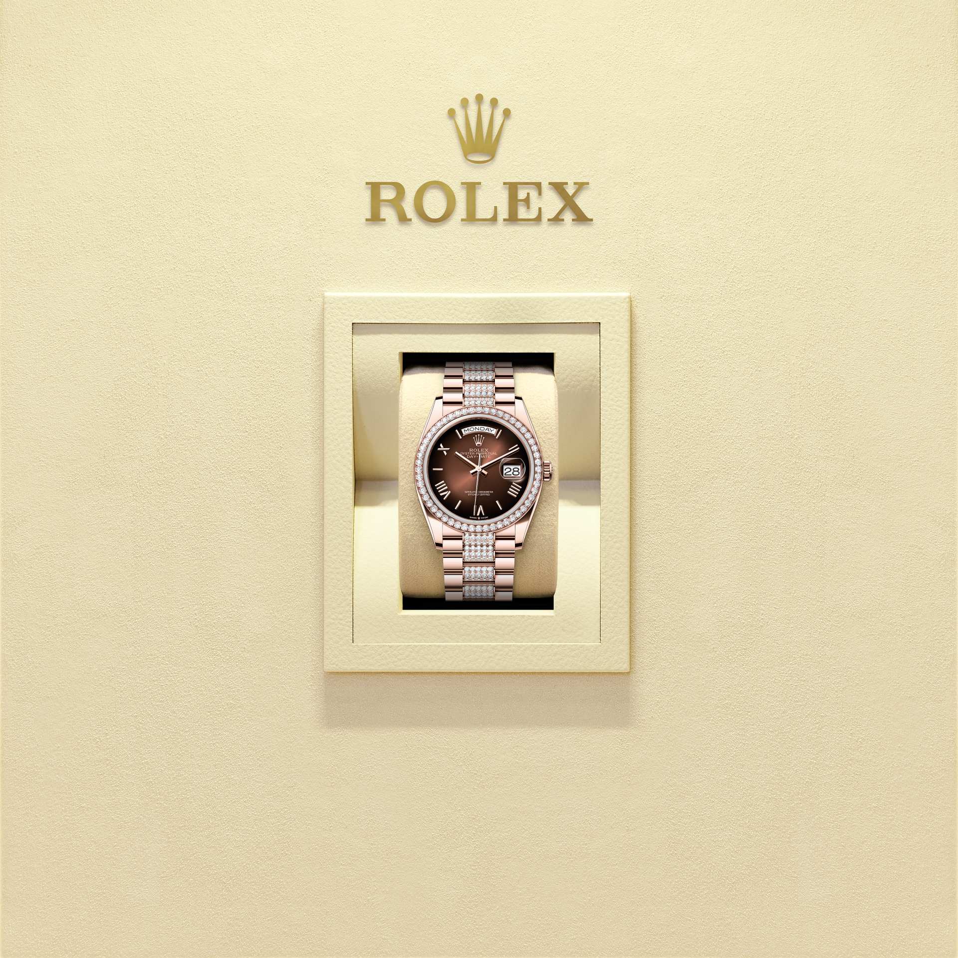 The Oyster Perpetual Day-Date 36 in 18 ct Everose gold with a brown ombré dial, diamond-set bezel and a diamond-set President bracelet.