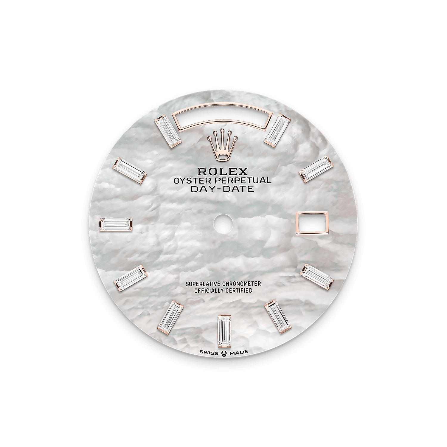 The Oyster Perpetual Day-Date 36 in 18 ct Everose gold, with a white mother-of-pearl, diamond-set dial, diamond-set bezel and a diamond-set President bracelet.