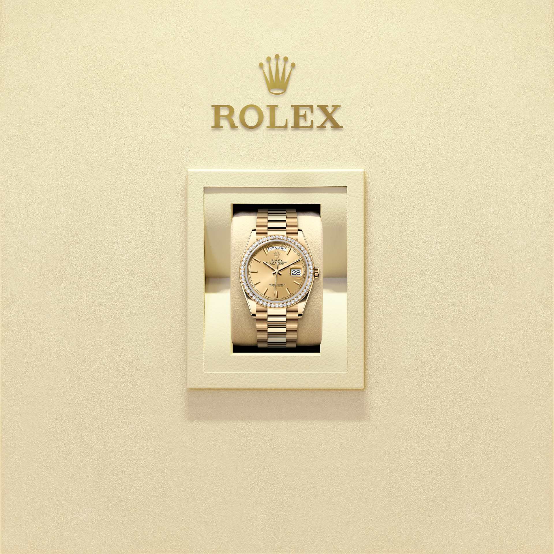 The Oyster Perpetual Day-Date 36 in 18 ct yellow gold with a champagne-colour dial, diamond-set bezel and a President bracelet.