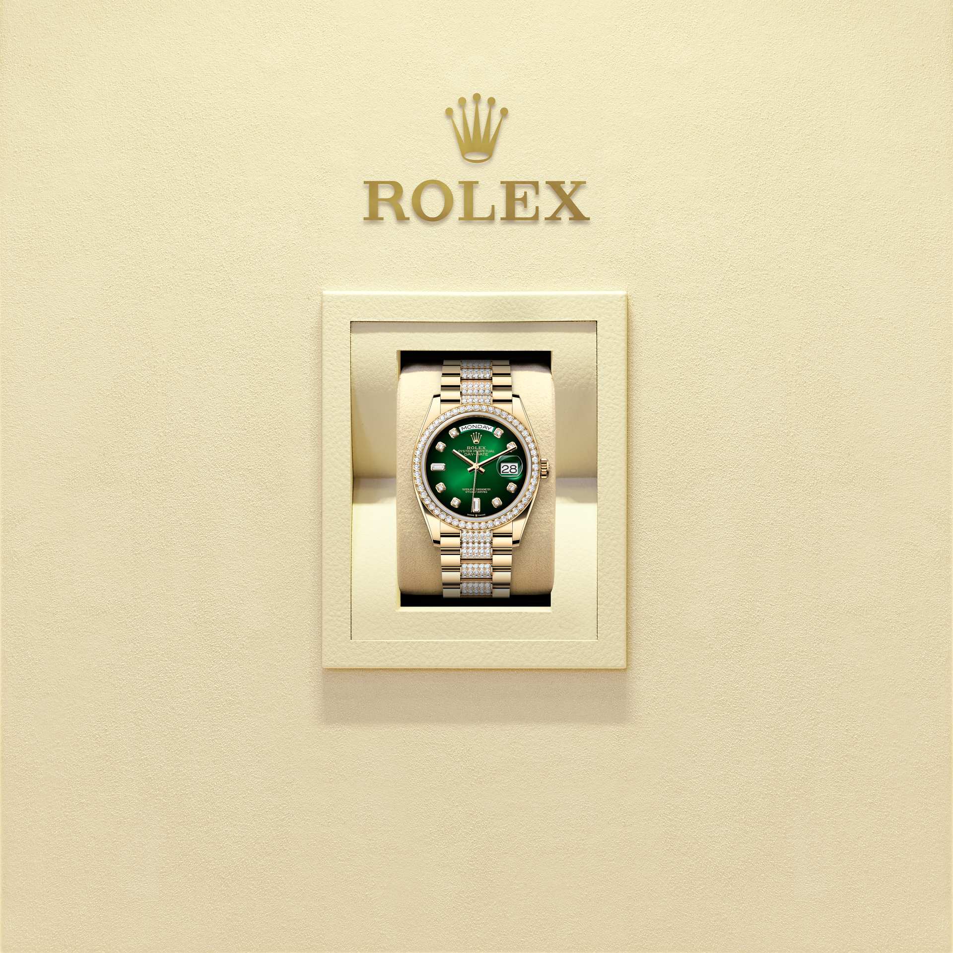 The Oyster Perpetual Day-Date 36 in 18 ct yellow gold, with a green ombré, diamond-set dial, diamond-set bezel and a diamond-set President bracelet.