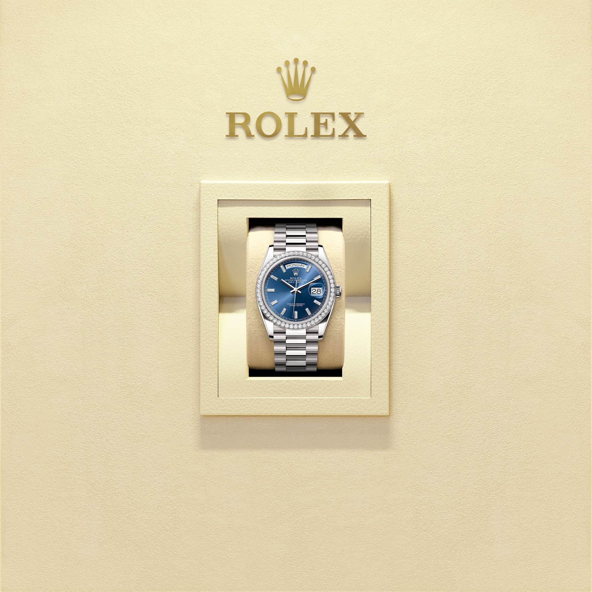 The Oyster Perpetual Day-Date 36 in 18 ct white gold, with a bright blue, diamond-set dial, diamond-set bezel and a President bracelet.