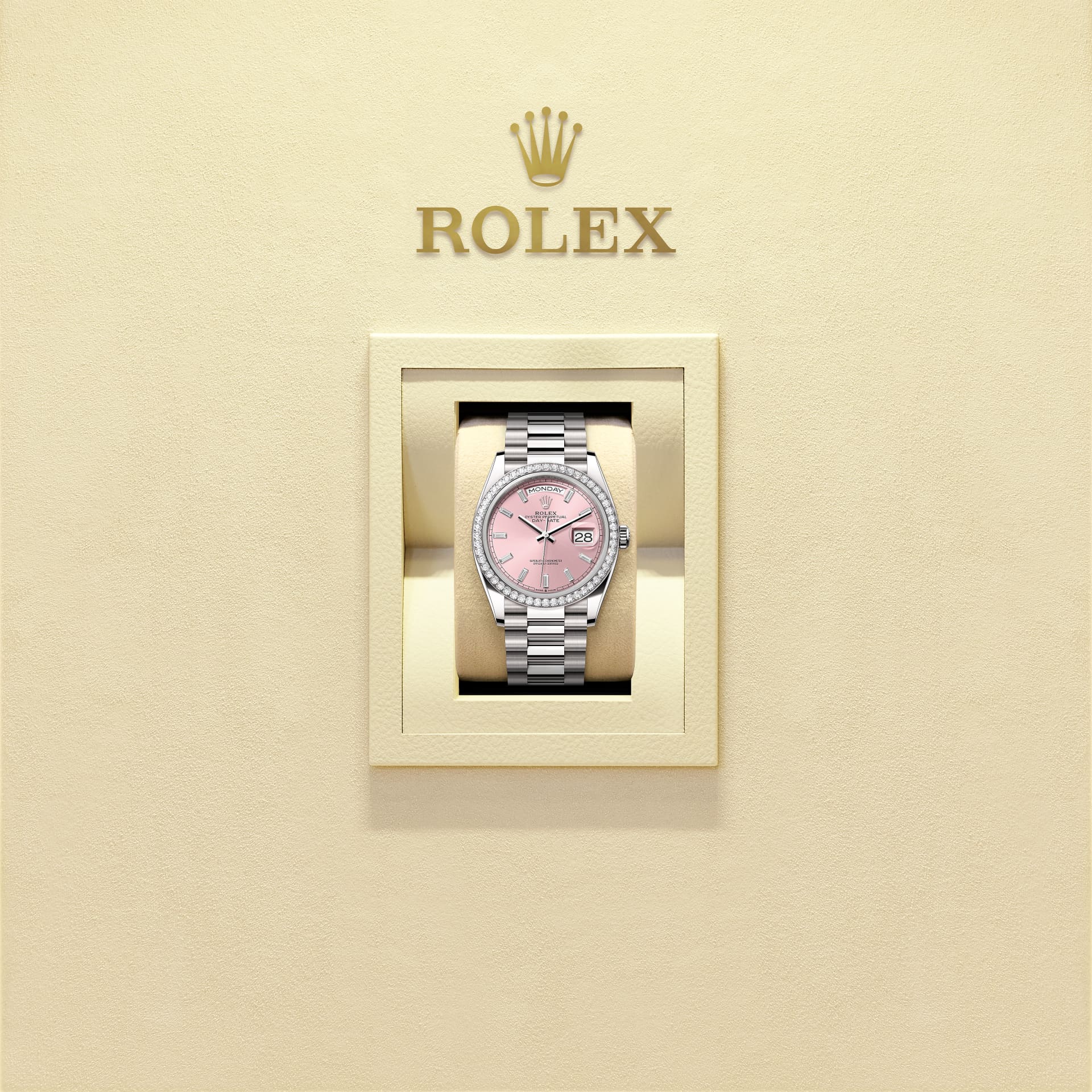 The Oyster Perpetual Day-Date 36 in 18 ct white gold, with a pink, diamond-set dial, diamond-set bezel and a President bracelet.