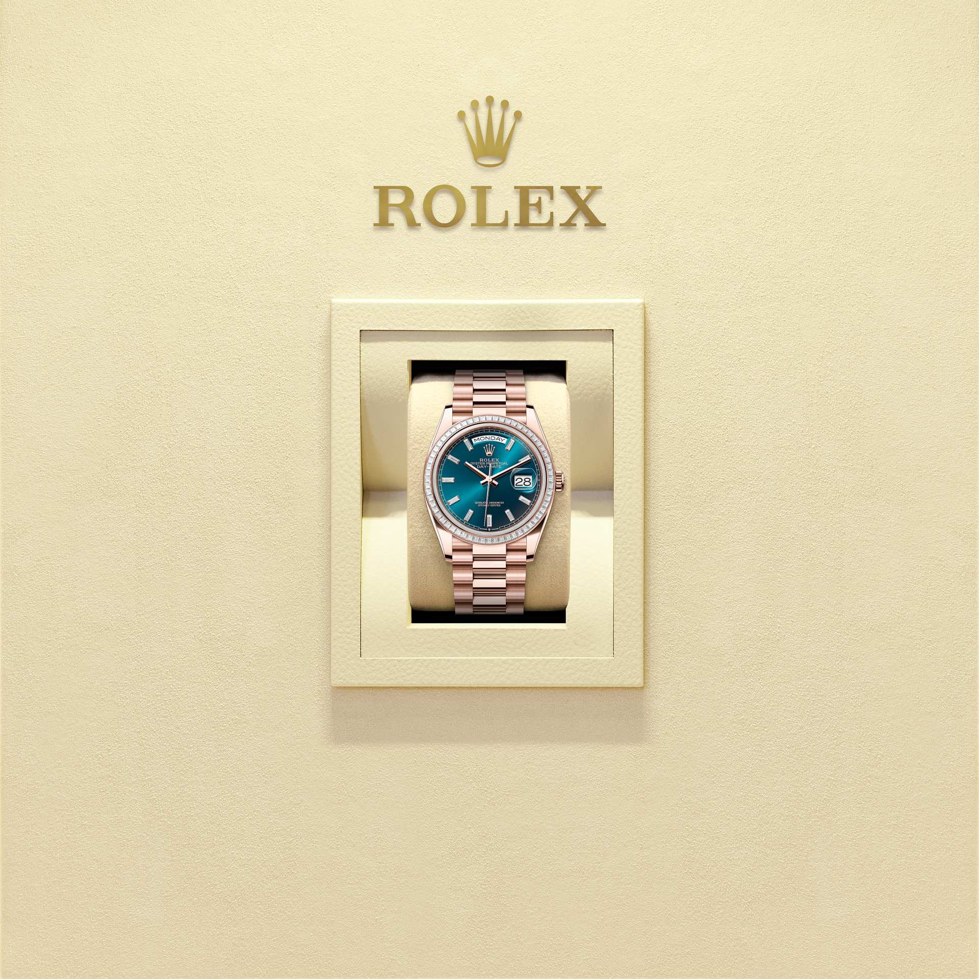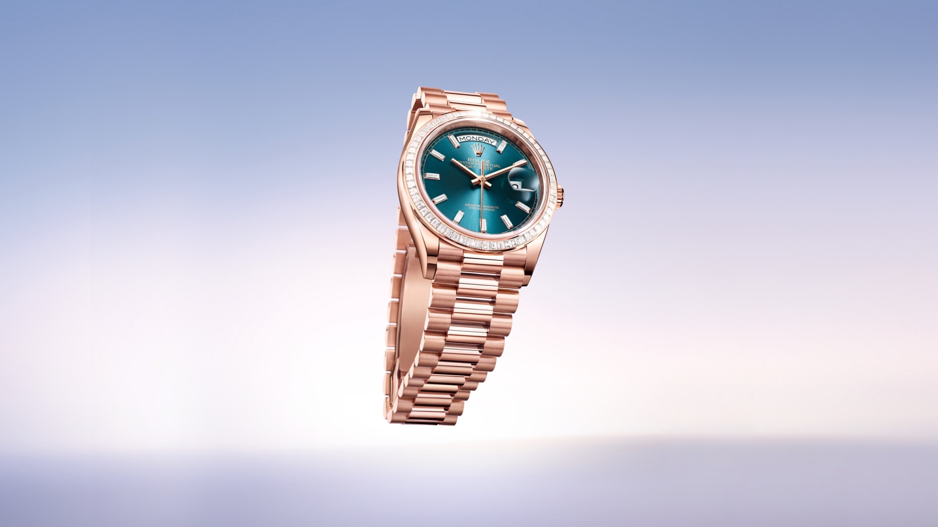The Oyster Perpetual Day-Date 36 in 18 ct Everose gold, with a blue-green, diamond-set dial, diamond-set bezel and a President bracelet.