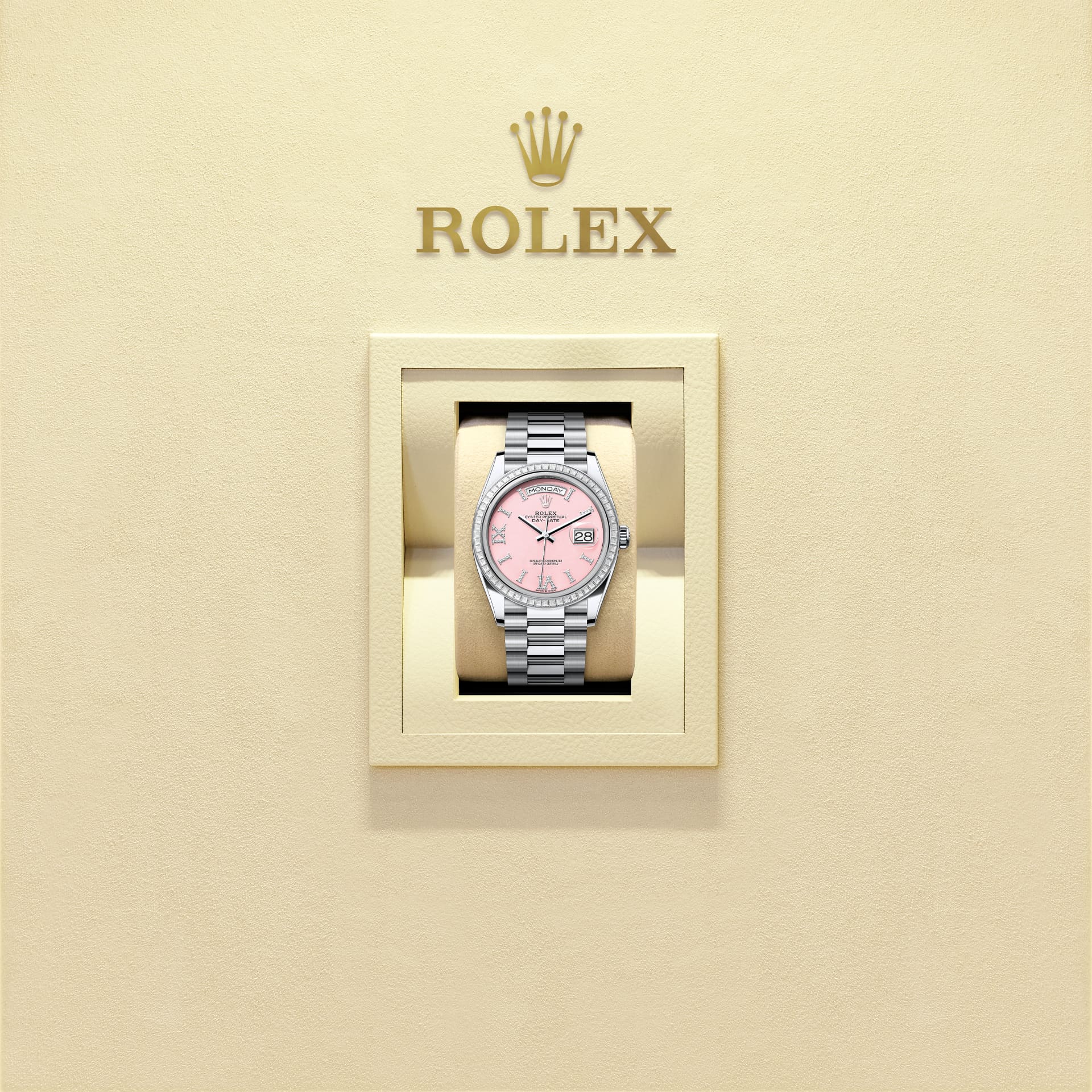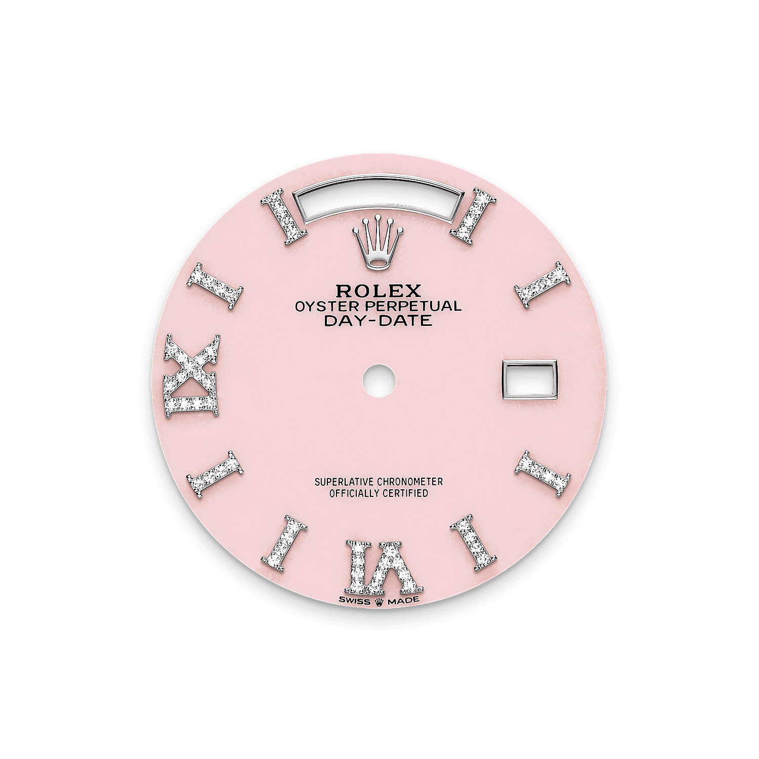 This dial features hour markers in 18 ct gold, set with 32 diamonds, and a Roman VI and IX in 18 ct gold, set with 24 diamonds. Rolex has developed special expertise in the creation of dials made from decorative stone, such as pink opal.