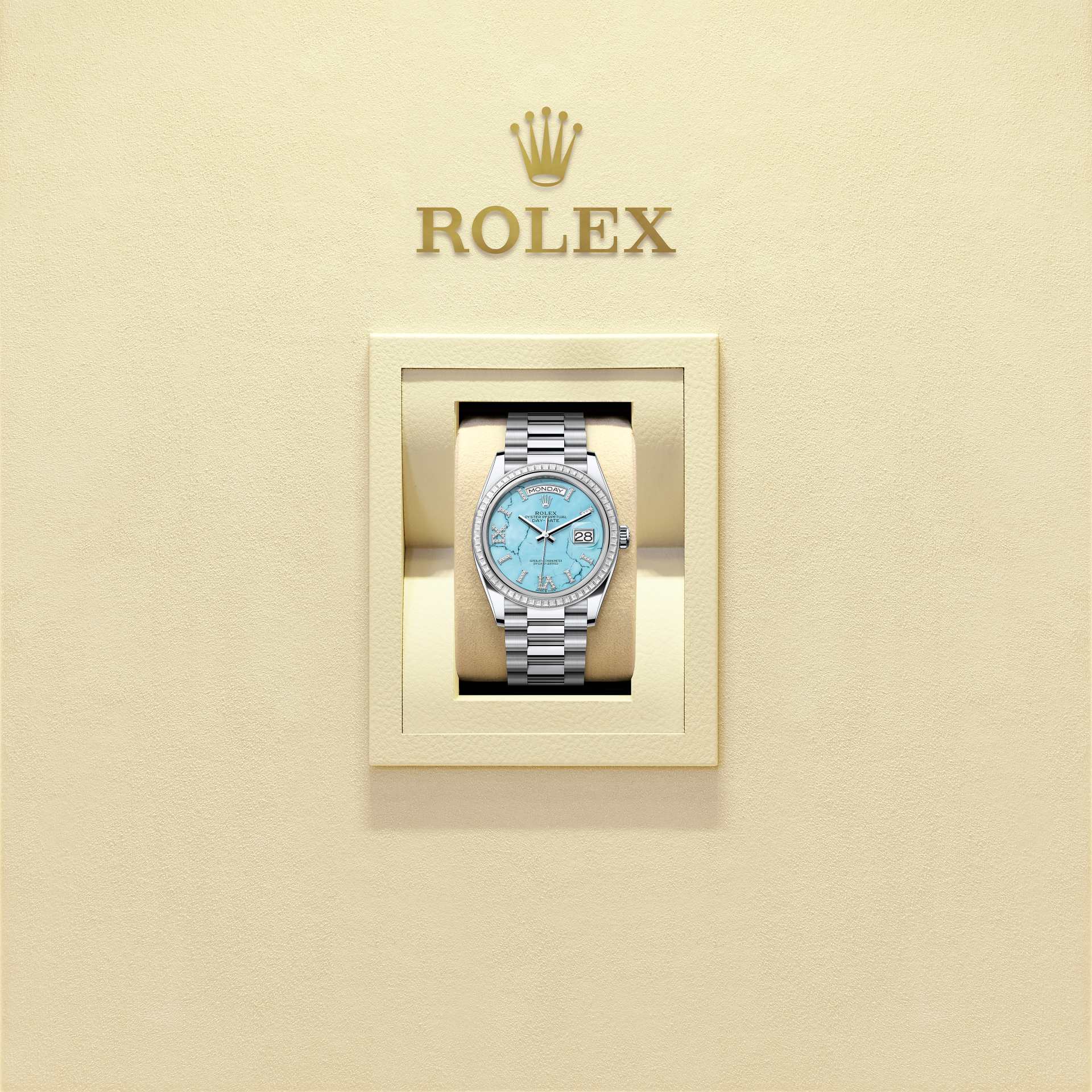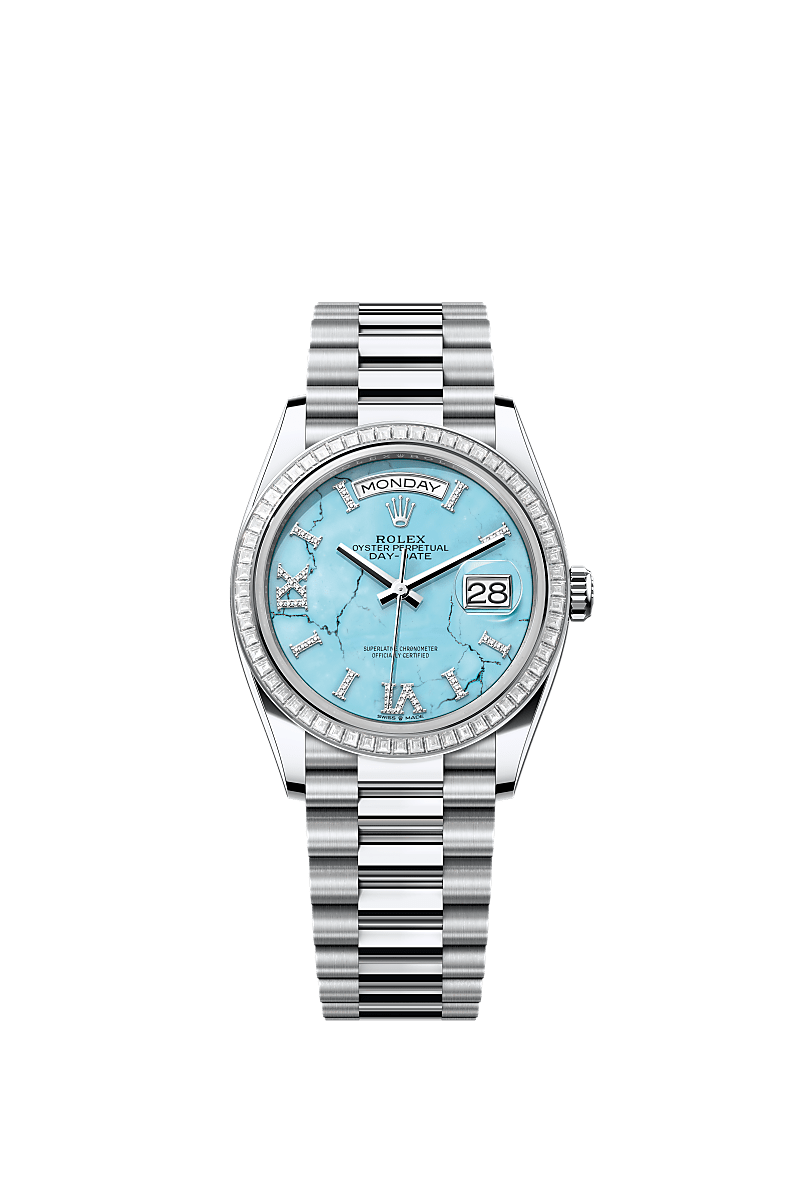 Only found in a few places on Earth, turquoise has been prized for thousands of years for its special hue. Rolex selects turquoise for the beauty of its structure and its characteristic, rare blue colour, because it marries perfectly with yellow and white gold. It is exclusively reserved for gold or platinum versions of the Day-Date 36.