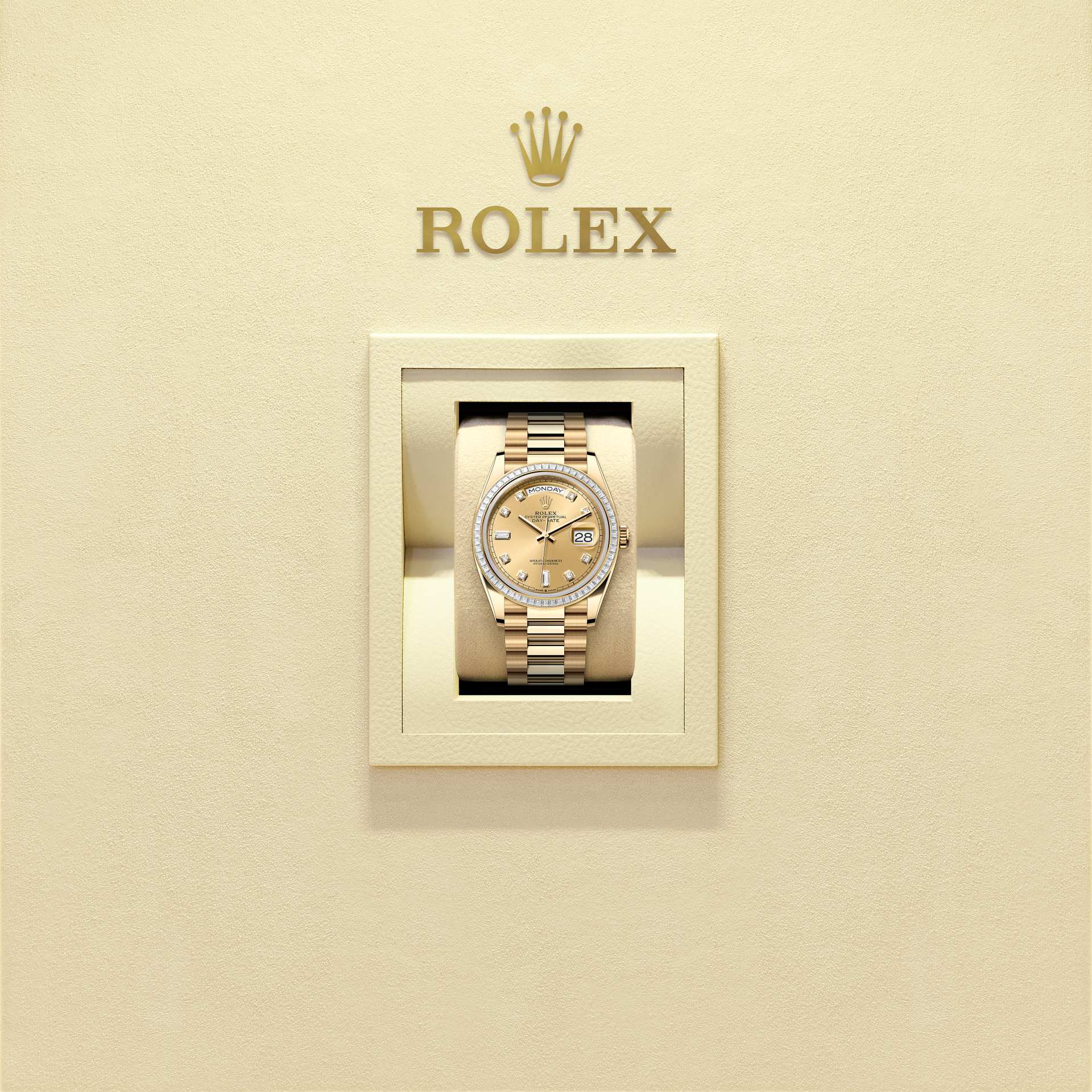 The Oyster Perpetual Day-Date 36 in 18 ct yellow gold, with a champagne-colour, diamond-set dial, diamond-set bezel and a President bracelet.