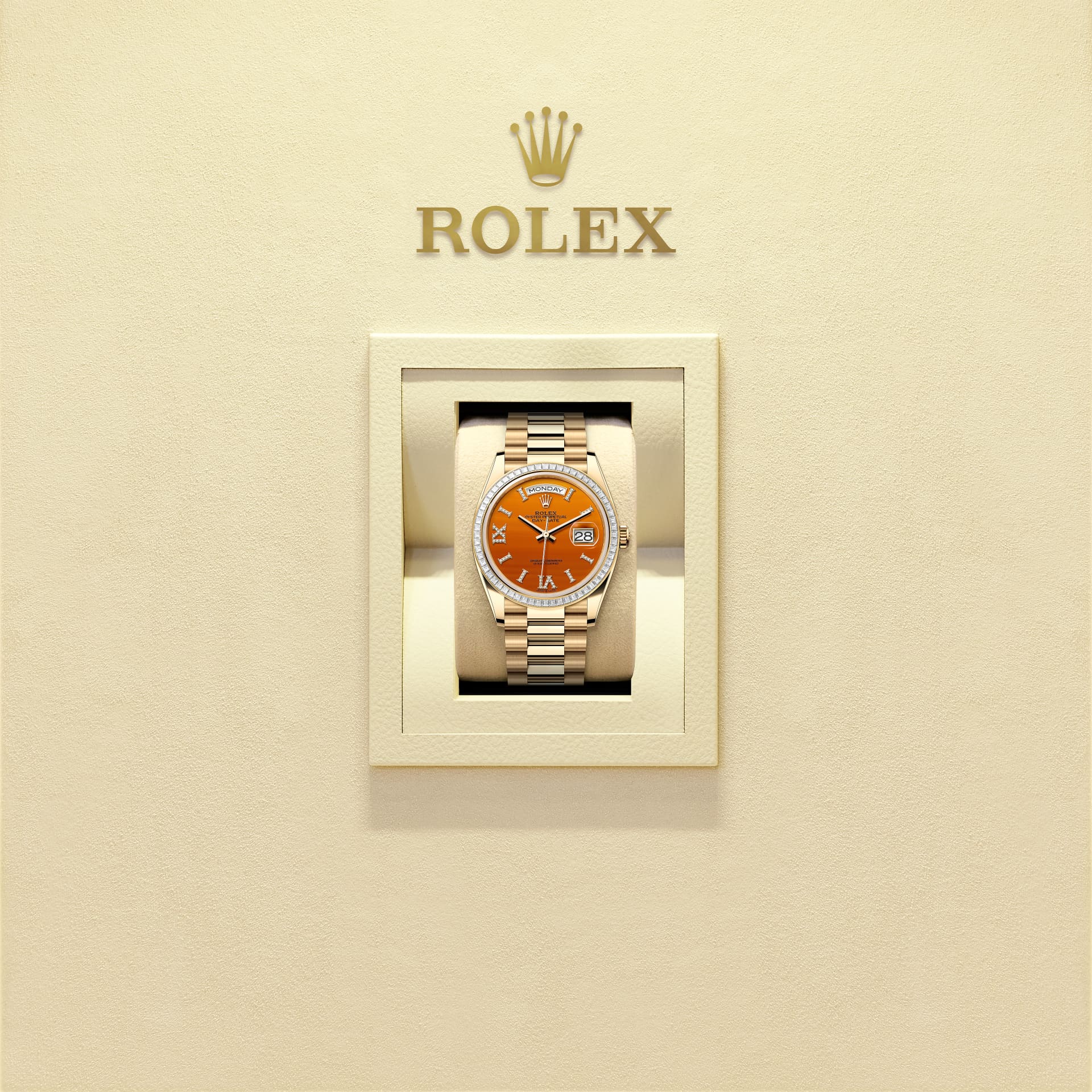 The Oyster Perpetual Day-Date 36 in 18 ct yellow gold, with a carnelian, diamond-set dial, diamond-set bezel and a President bracelet.