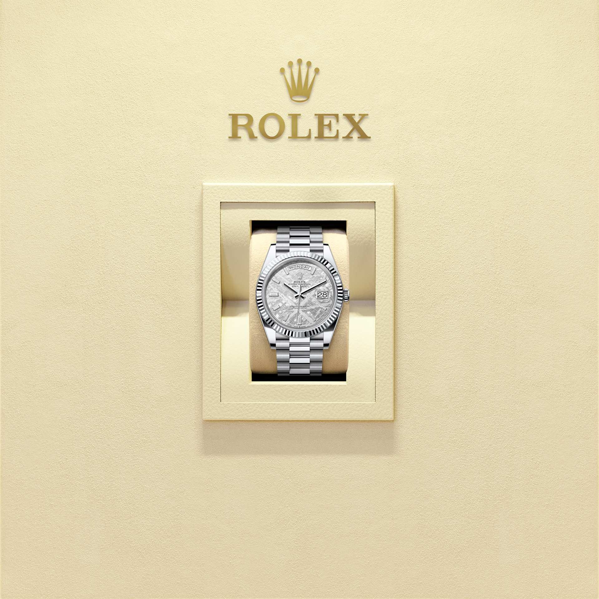 The Oyster Perpetual Day-Date 40 in platinum with a meteorite, diamond-set dial, fluted bezel and a President bracelet.