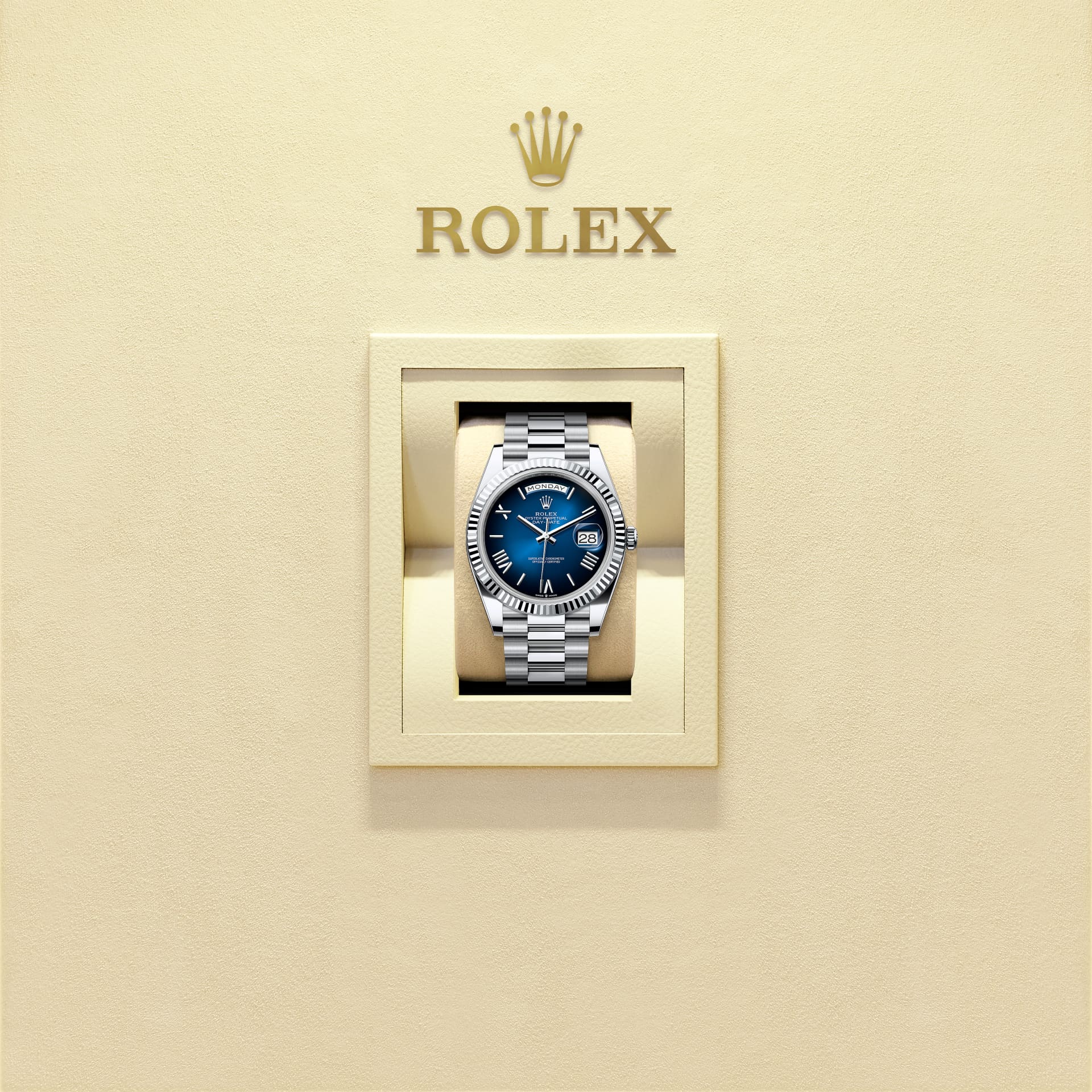 The Oyster Perpetual Day-Date 40 in platinum with a blue ombré dial, fluted bezel and a President bracelet.