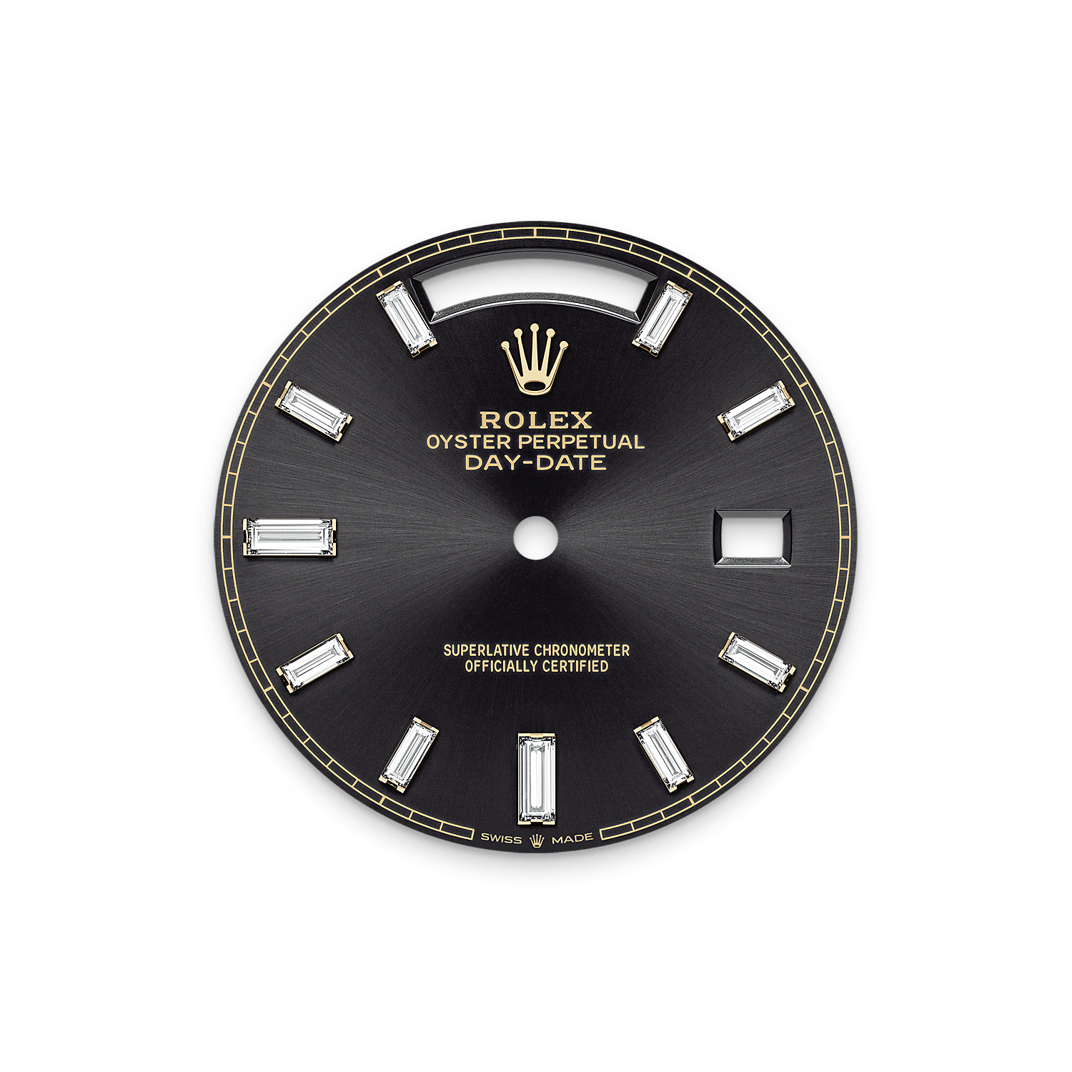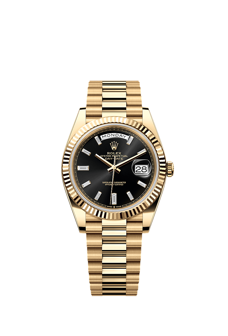 The Oyster Perpetual Day-Date 40 in 18 ct yellow gold with a bright black, diamond-set dial, fluted bezel and a President bracelet.