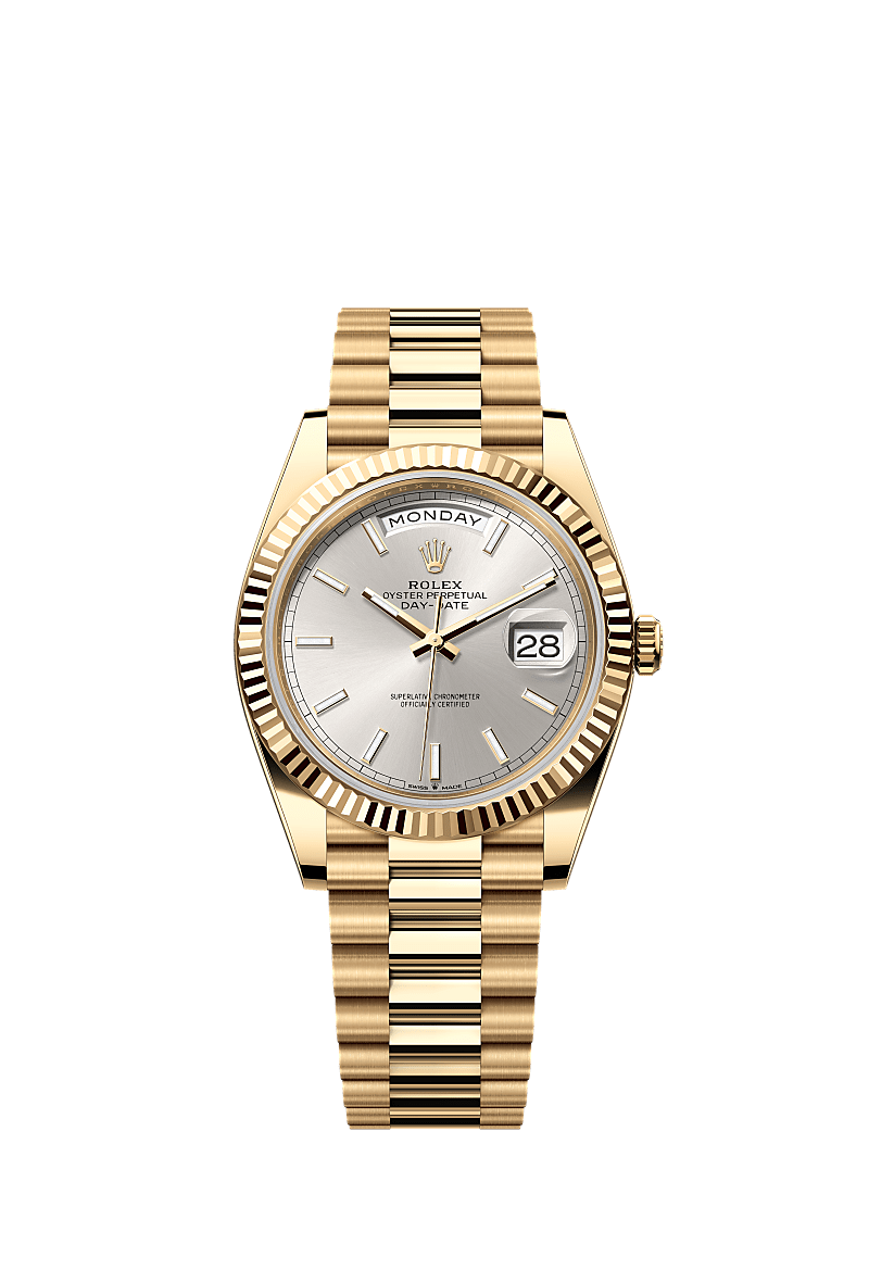 The Oyster Perpetual Day-Date 40 in 18 ct yellow gold with a silver dial, fluted bezel and a President bracelet.
