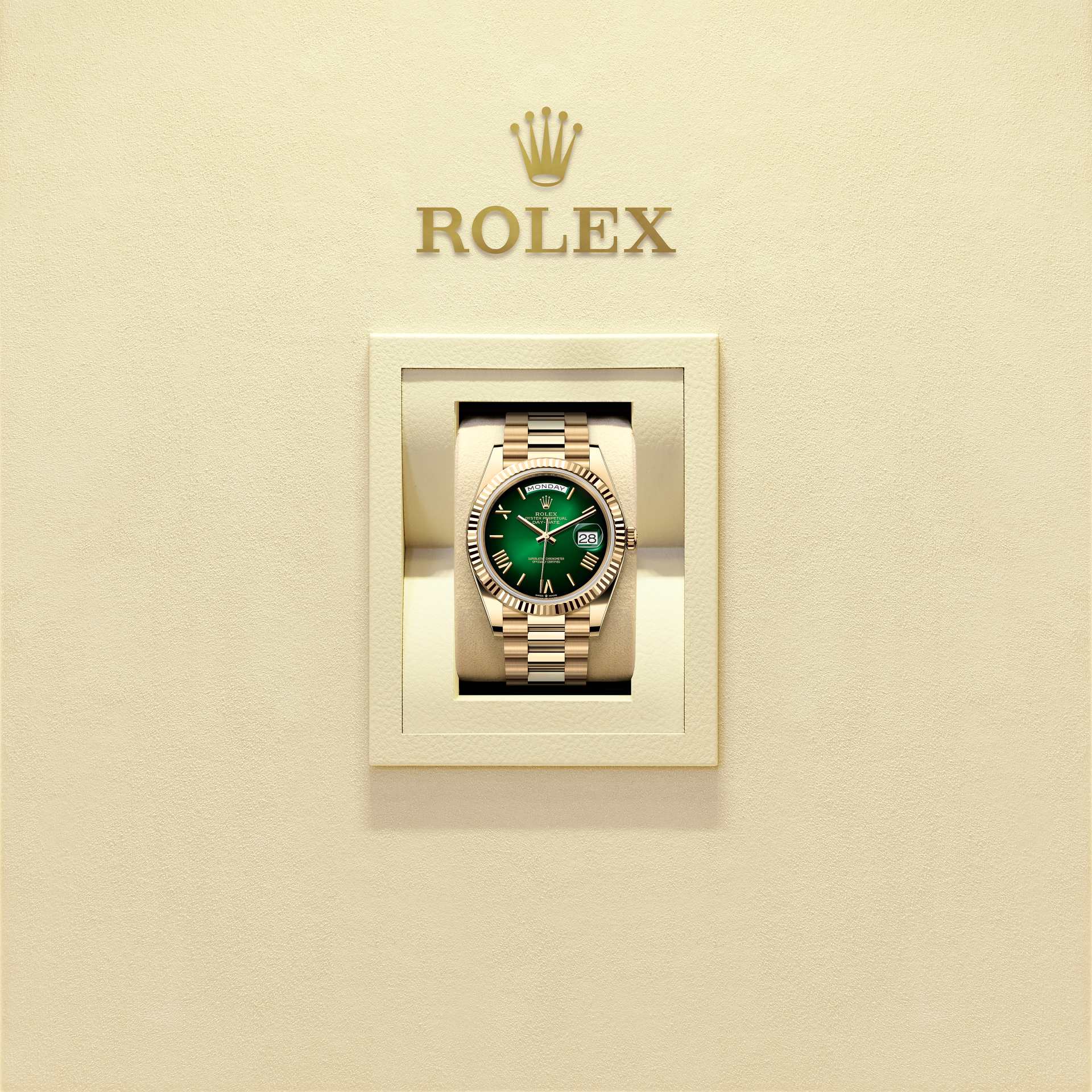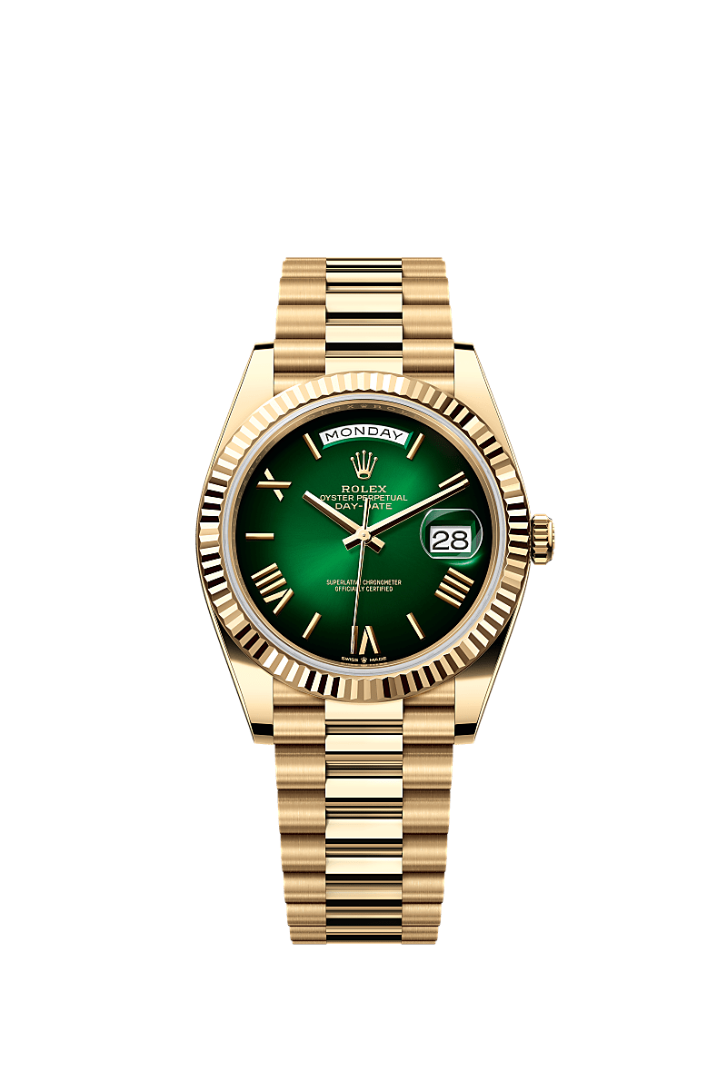 The Oyster Perpetual Day-Date 40 in 18 ct yellow gold with a green ombré dial, fluted bezel and a President bracelet.