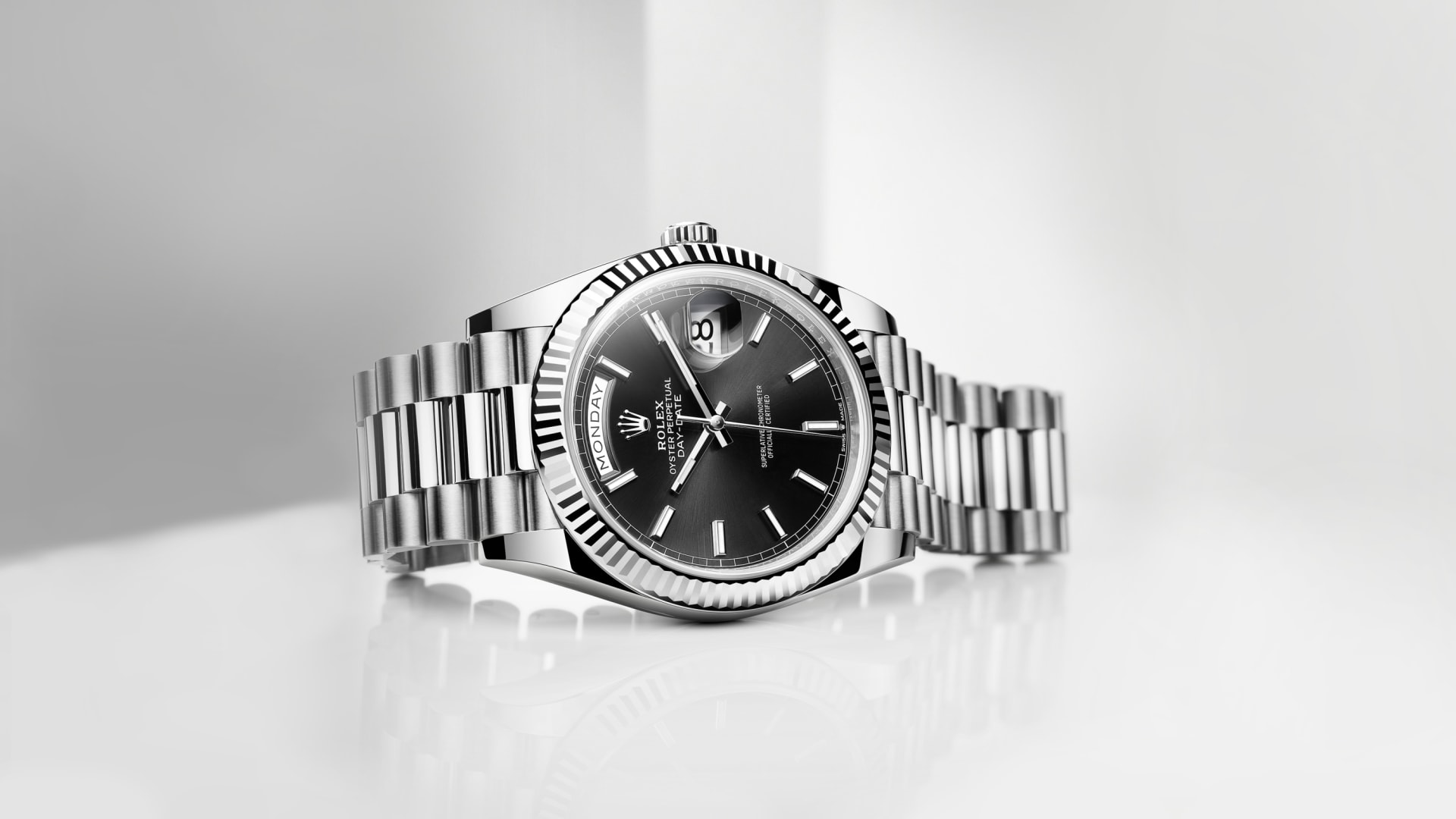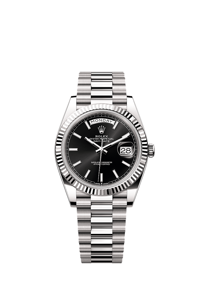 The Oyster Perpetual Day-Date 40 in 18 ct white gold with a bright black dial, fluted bezel and a President bracelet.
