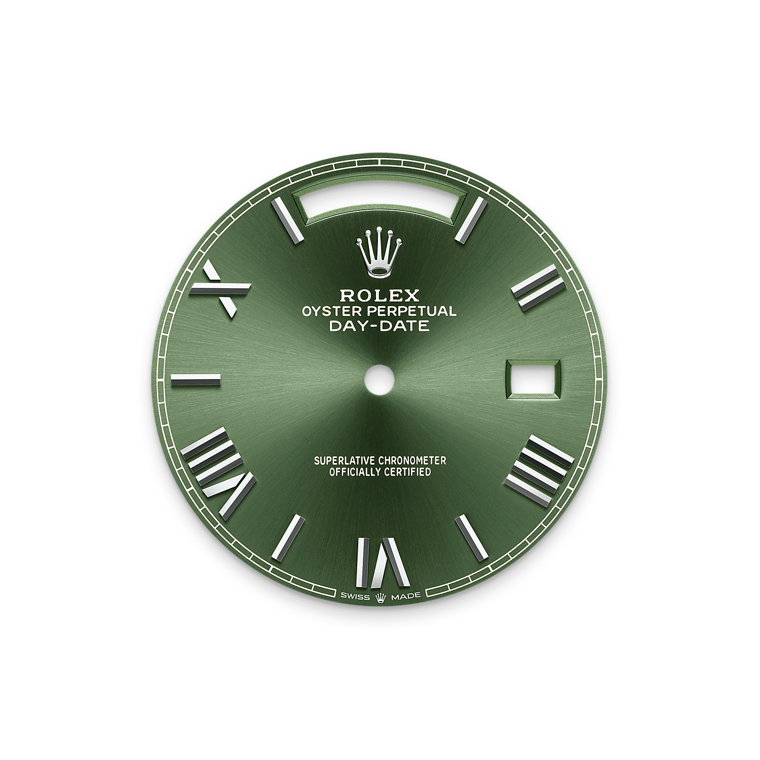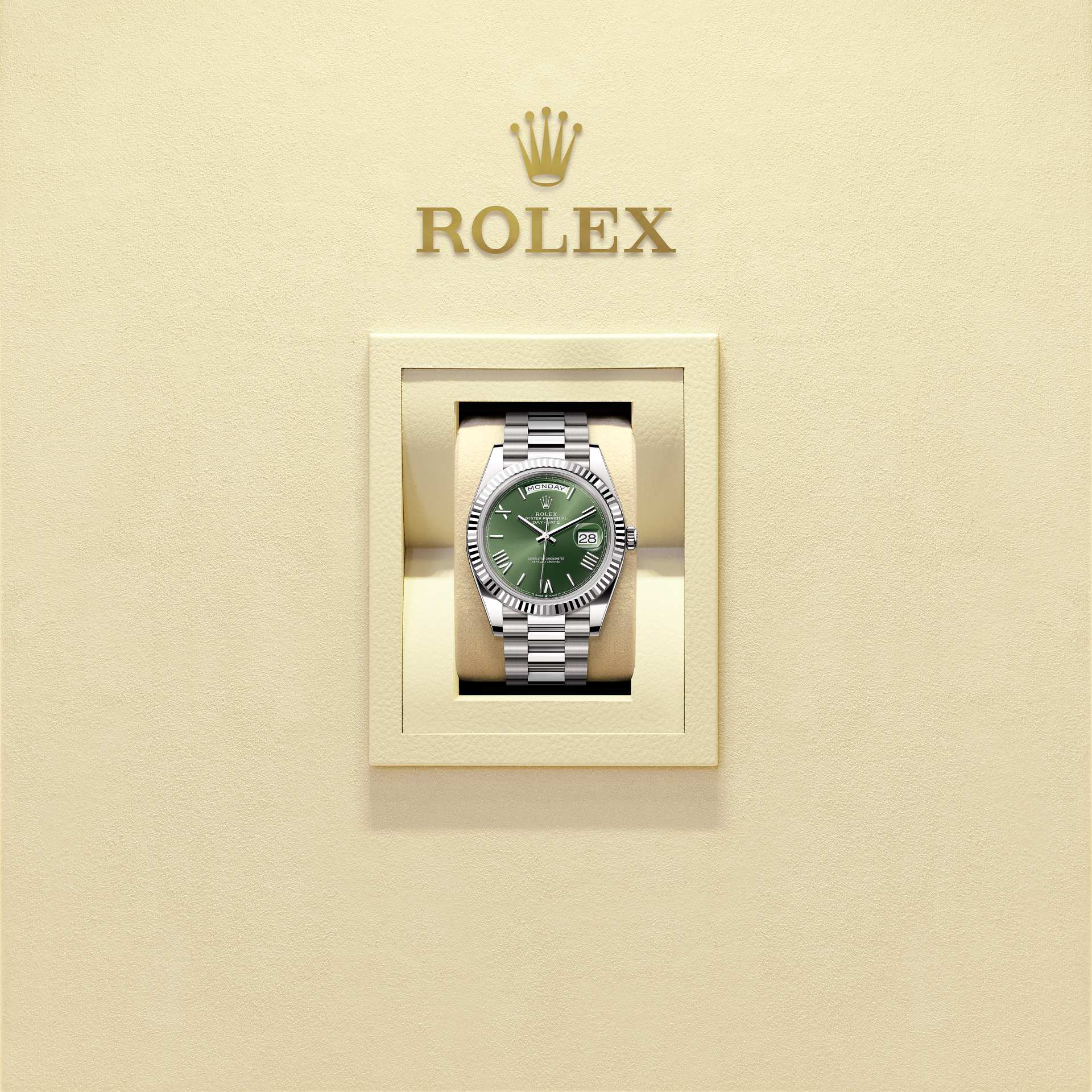 The Oyster Perpetual Day-Date 40 in 18 ct white gold with an olive-green dial, fluted bezel and a President bracelet.