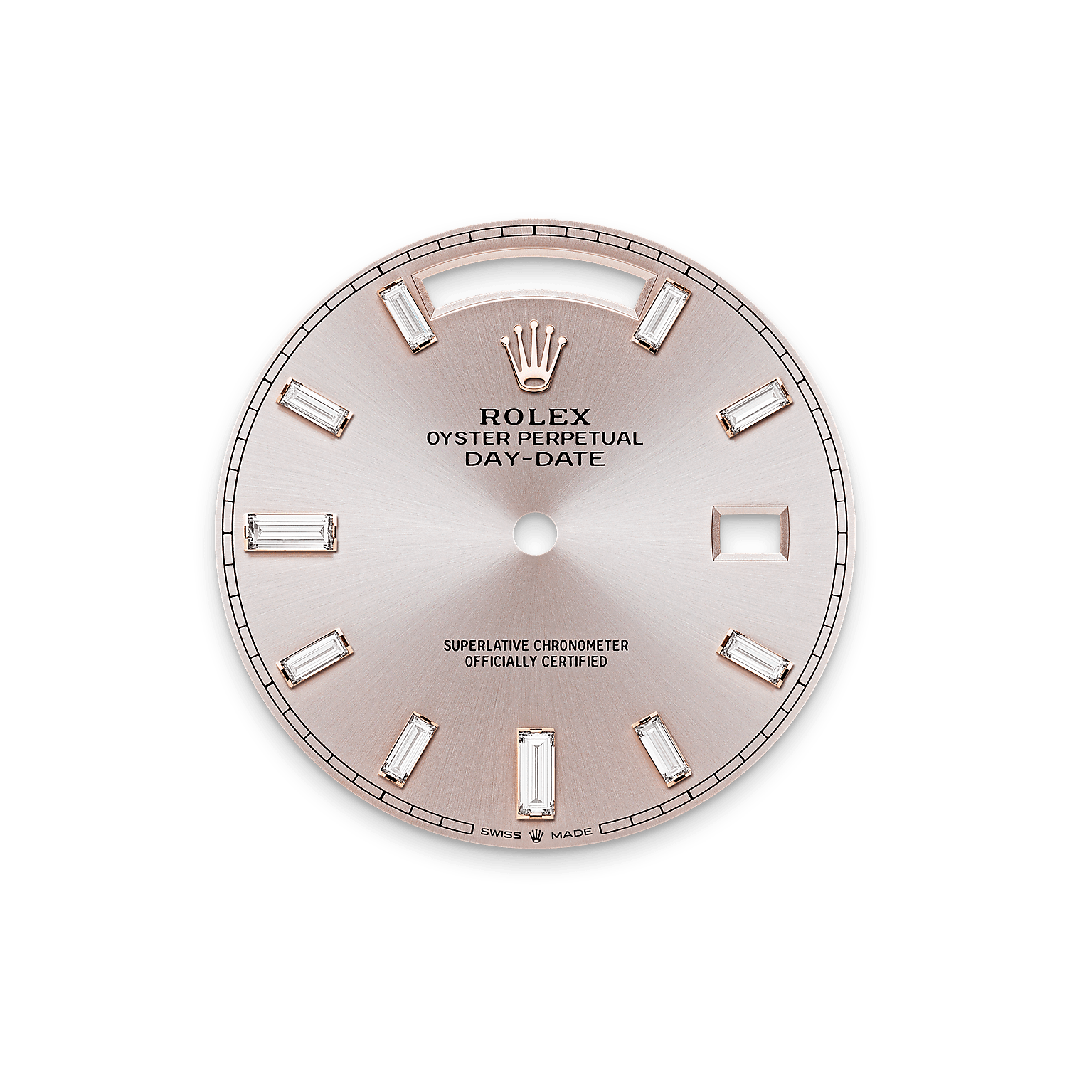 The Oyster Perpetual Day-Date 40 in 18 ct Everose gold, with a Sundust, diamond-set dial, diamond-set bezel and a President bracelet.