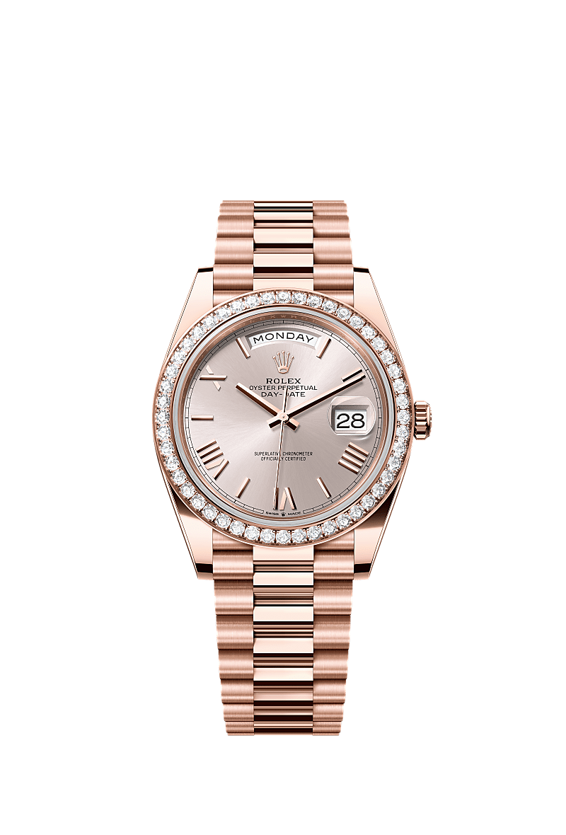 The Oyster Perpetual Day-Date 40 in 18 ct Everose gold with a Sundust dial, diamond-set bezel and a President bracelet.