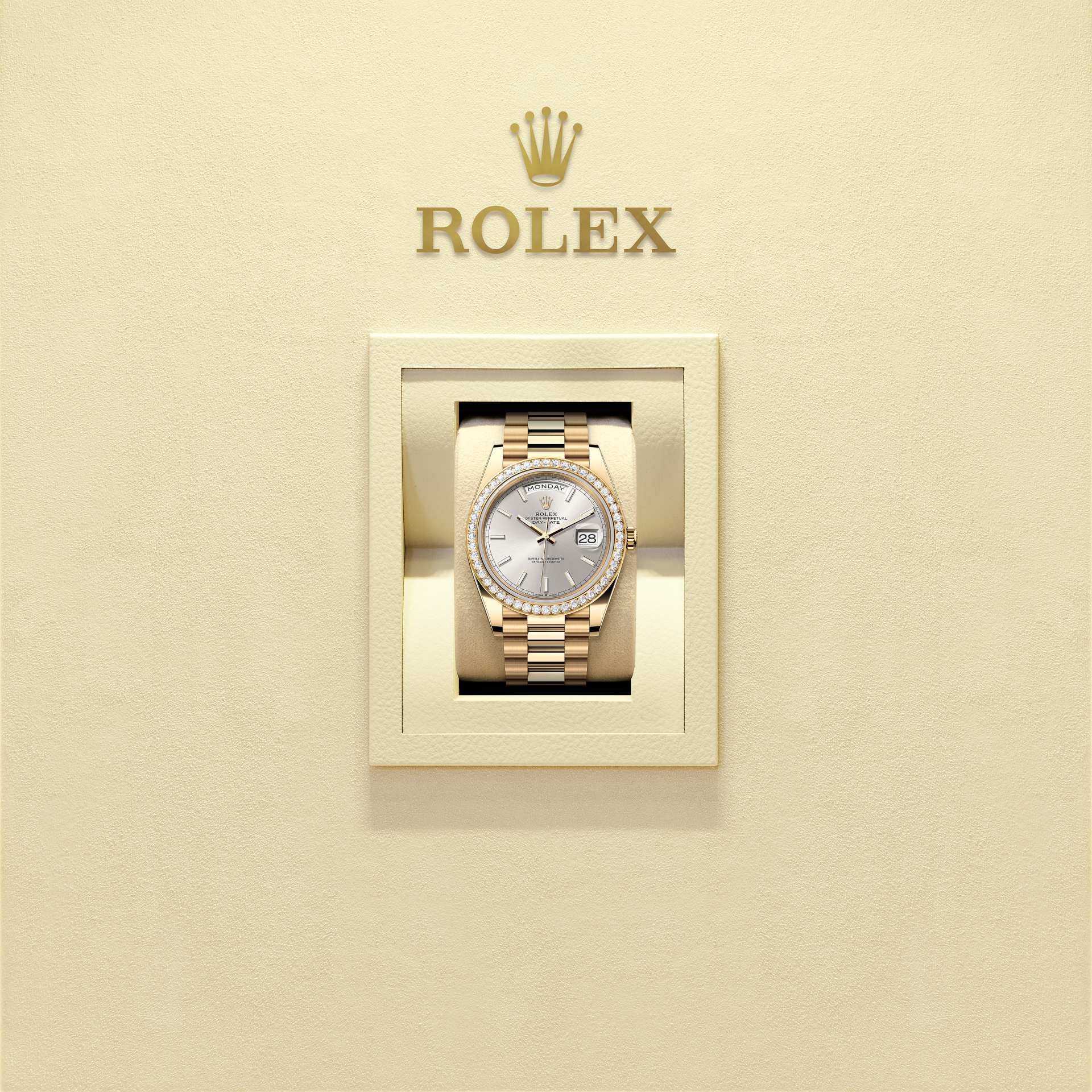 The Oyster Perpetual Day-Date 40 in 18 ct yellow gold with a silver dial, diamond-set bezel and a President bracelet.