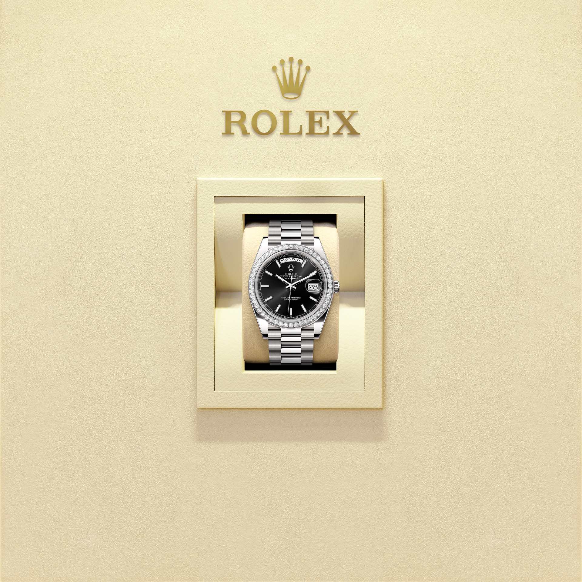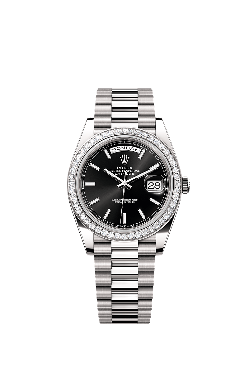 The Oyster Perpetual Day-Date 40 in 18 ct white gold with a bright black dial, diamond-set bezel and a President bracelet.
